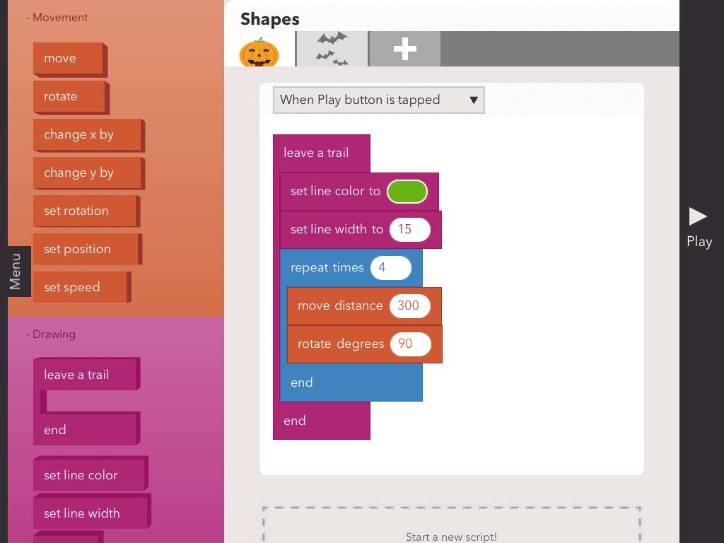 That was a bit harder. And some students figured out if you used the repeat block, some interesting triangle designs resulted! And here is the basic square and triangle we aimed to code for today.