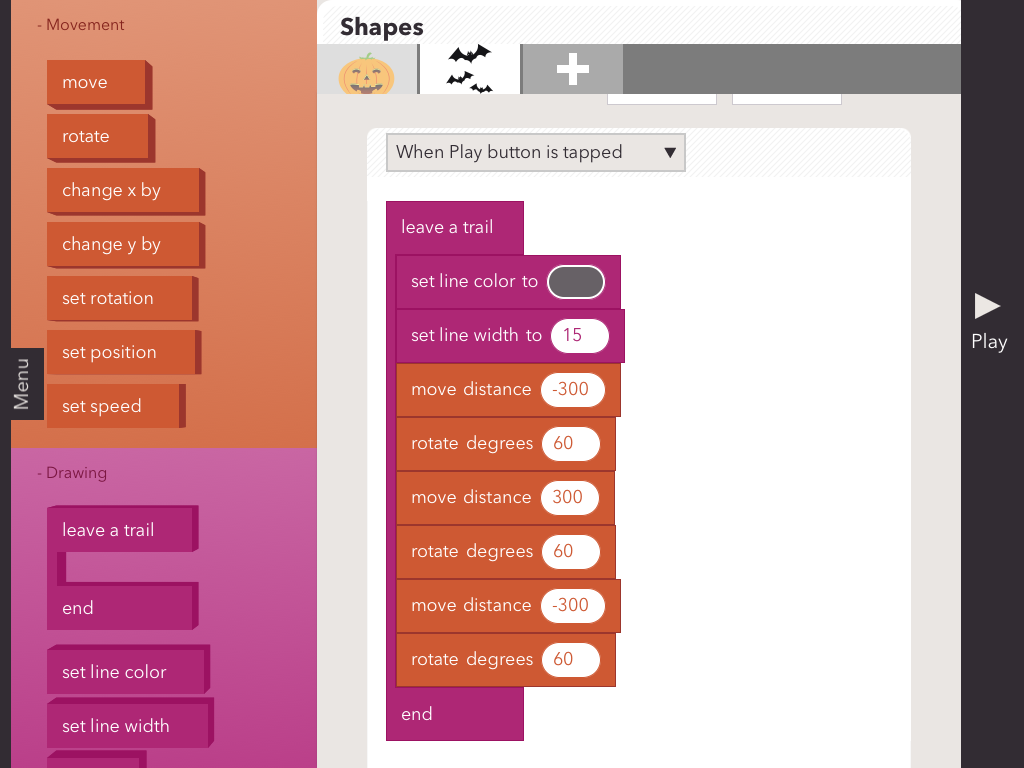 I hope students take away the value of being able to make the characters do what they want them to do. This planning is not to get in the way of “happy accidents” but instead to help students do more than move blocks and push play randomly. I know that many of our students can hardly wait to create some more triangle designs. Our next invitation might be, what picture can you make with triangles and squares?