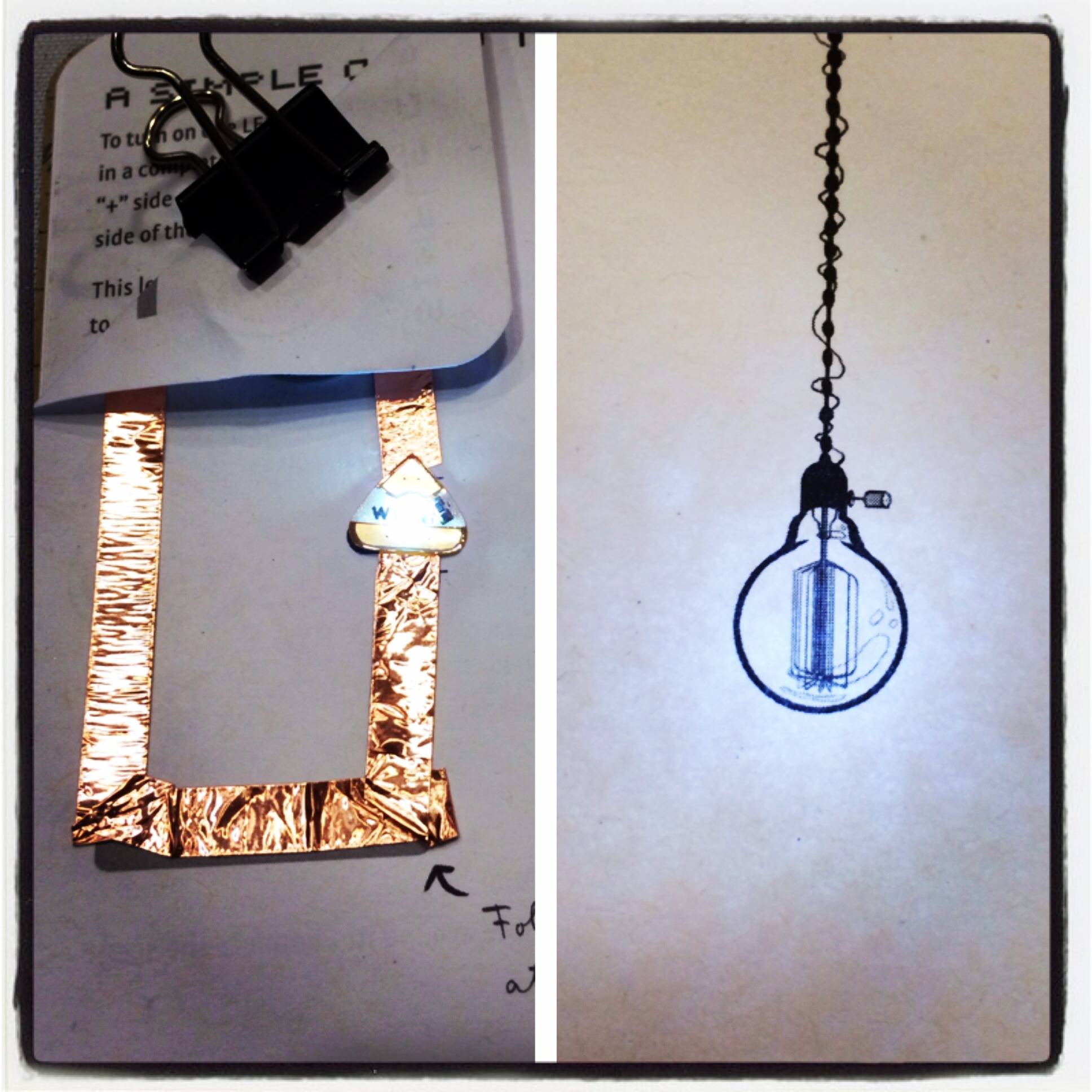 Our first task was to follow specific instructions and a diagram to lay down the copper tape, attach the LEDs, and then attach the battery to make the lights light up. We followed a very specific diagram while learning (or being reminded) about the basics of circuitry. That part was pretty easy…we just had to make sure that the pluses and minuses were facing in the right direction, that foil touched the electronics and didn’t touch places that would make a short. And when we were successful, turning the page resulting in the light shining through the page and illuminating a lightbulb that we were then invited to draw and write around.