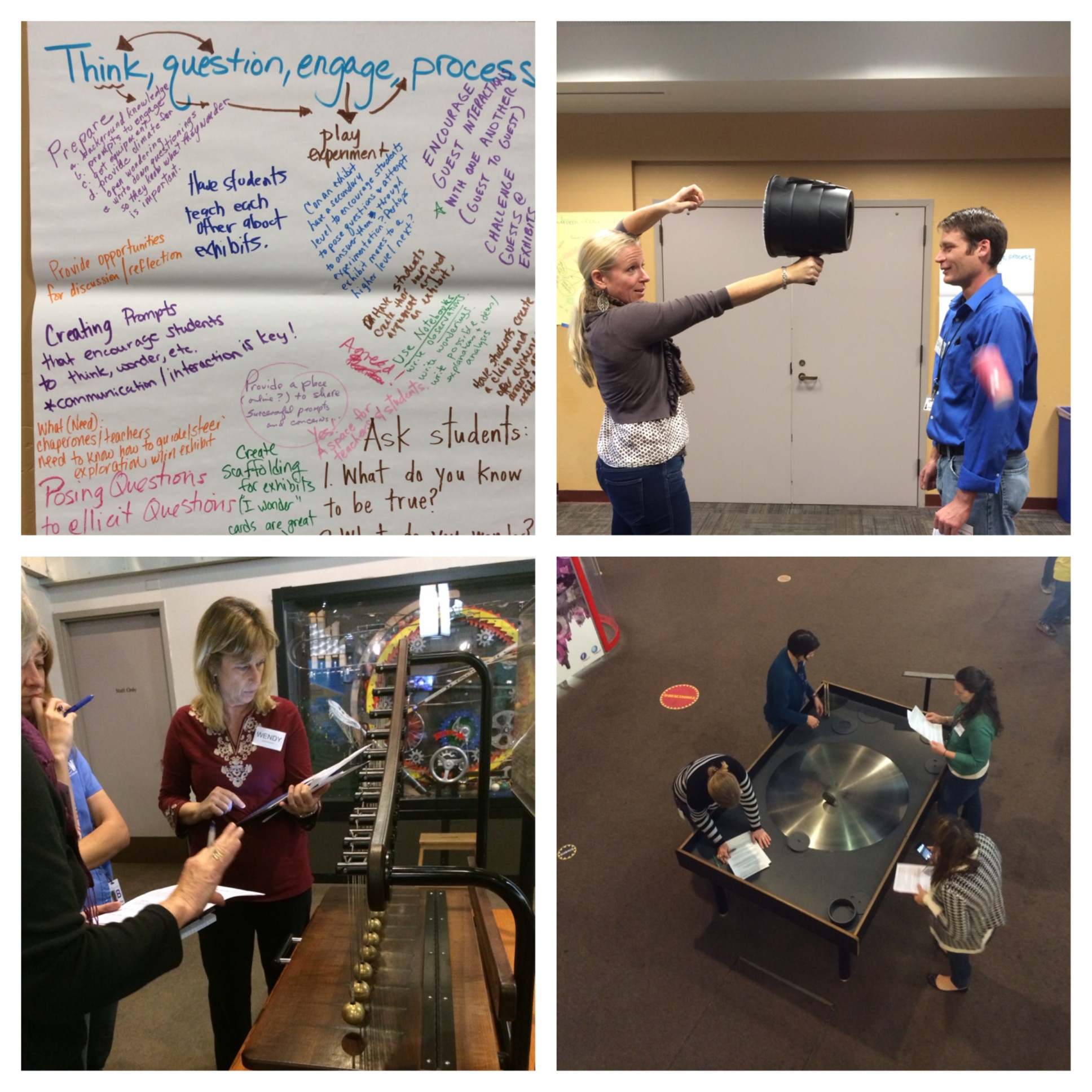 And the field trip was an opportunity to examine the tools in use, with the aim of improving them in a next iteration. We watched the kids in action, noting their conversation, their body language, their interaction with the exhibits…taking pictures, detailed field notes, video and audiotape…all with the goal of understanding their experience in order to improve students’ opportunities for learning and engagement. And…we were under strict orders to only observe–something very difficult for this group of hands-on educators dedicated to facilitating engaging learning experiences for students!