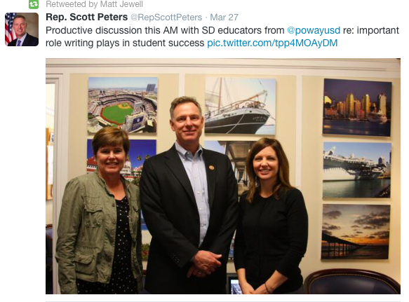 In San Diego there are five congressional representatives for the area the San Diego Area Writing Project serves. There are democrats and republicans, veteran politicians and those new to the job. Sometimes we meet directly with the representative, sometimes we meet with one of their aides. Some are knowledgeable about education, some are not. Sometimes we meet with the same person from year to year, others times we meet someone new. Sometimes our representatives are upbeat and hopeful, other times they are frustrated, and sometimes even curt. I can’t imagine how many people they meet with, each wanting their interest to be the priority.
