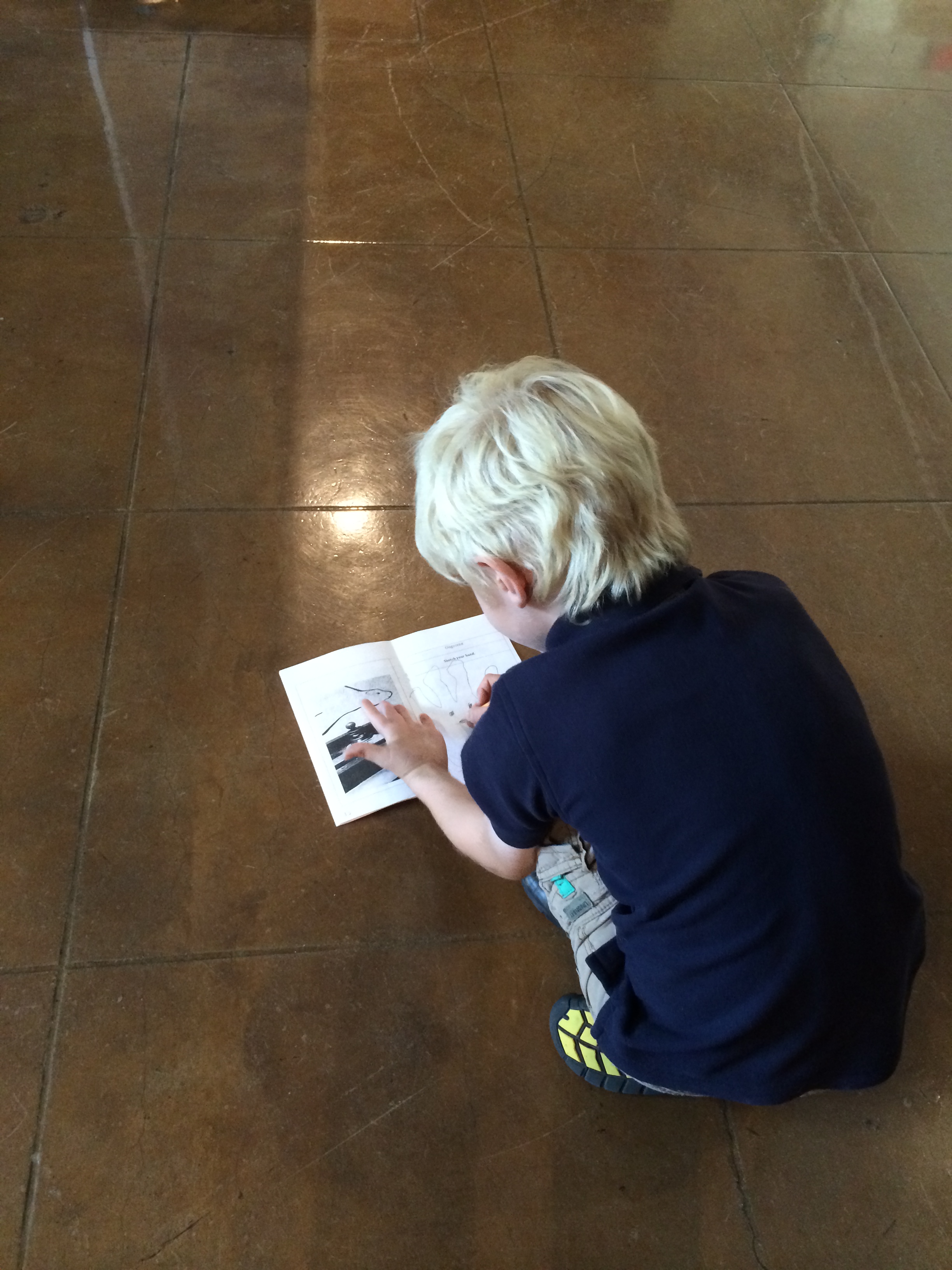 And I noticed students sketching and writing in their booklets–a space intended to invite student observations and deepen their thinking. Unfortunately, in many cases students and chaperones seemed to view the booklet as a duty, often filling in spaces as quickly as possible with little thought and attention. I did notice a student or two take some time…this little guy made himself quite comfortable in the middle of the floor, as he sketched and completed a page in his booklet.