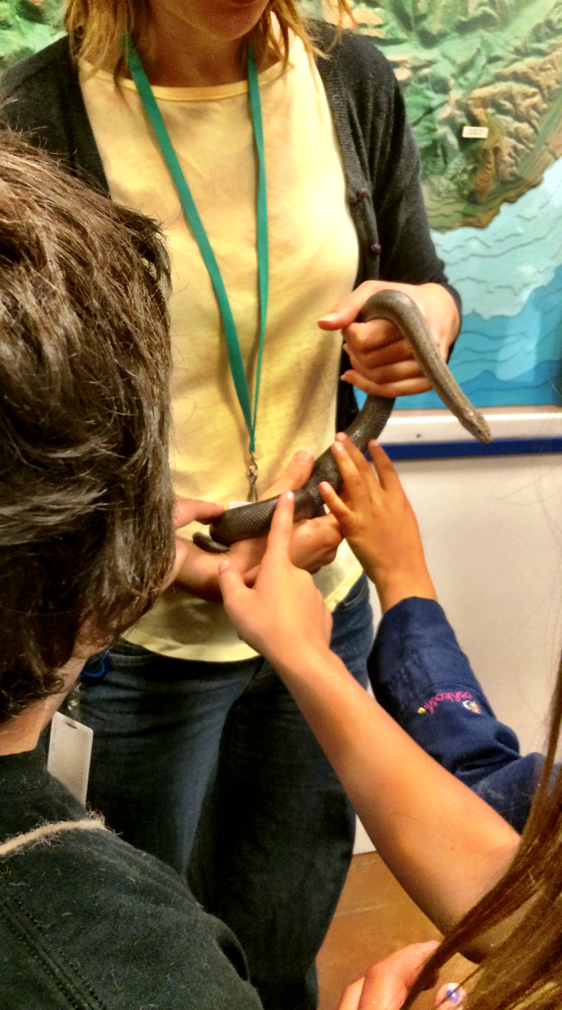 Before lunch, students had the opportunity to get close to a couple of snakes…and even touch them. They moved in close, asking questions of the the docent as they reached toward the snakes.