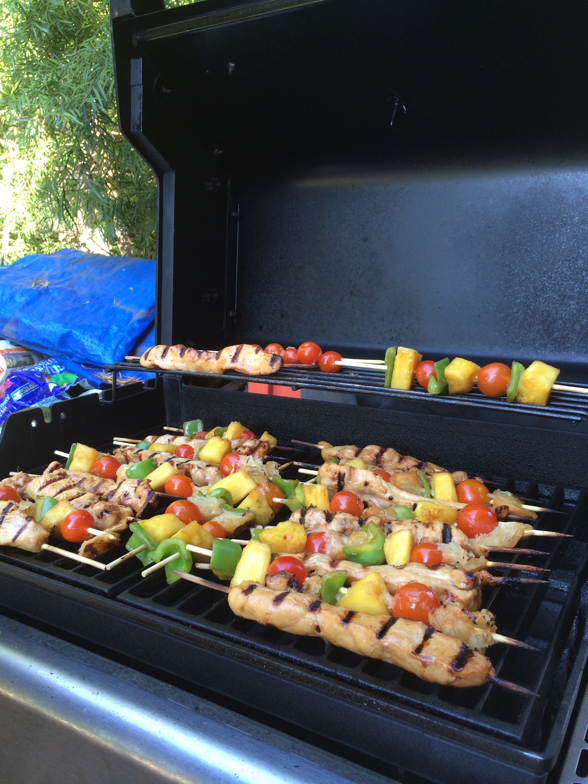 To celebrate the 4th of July, my husband went all out with his cooking. We started with chicken and fruits and veggies on skewers on the barbeque.