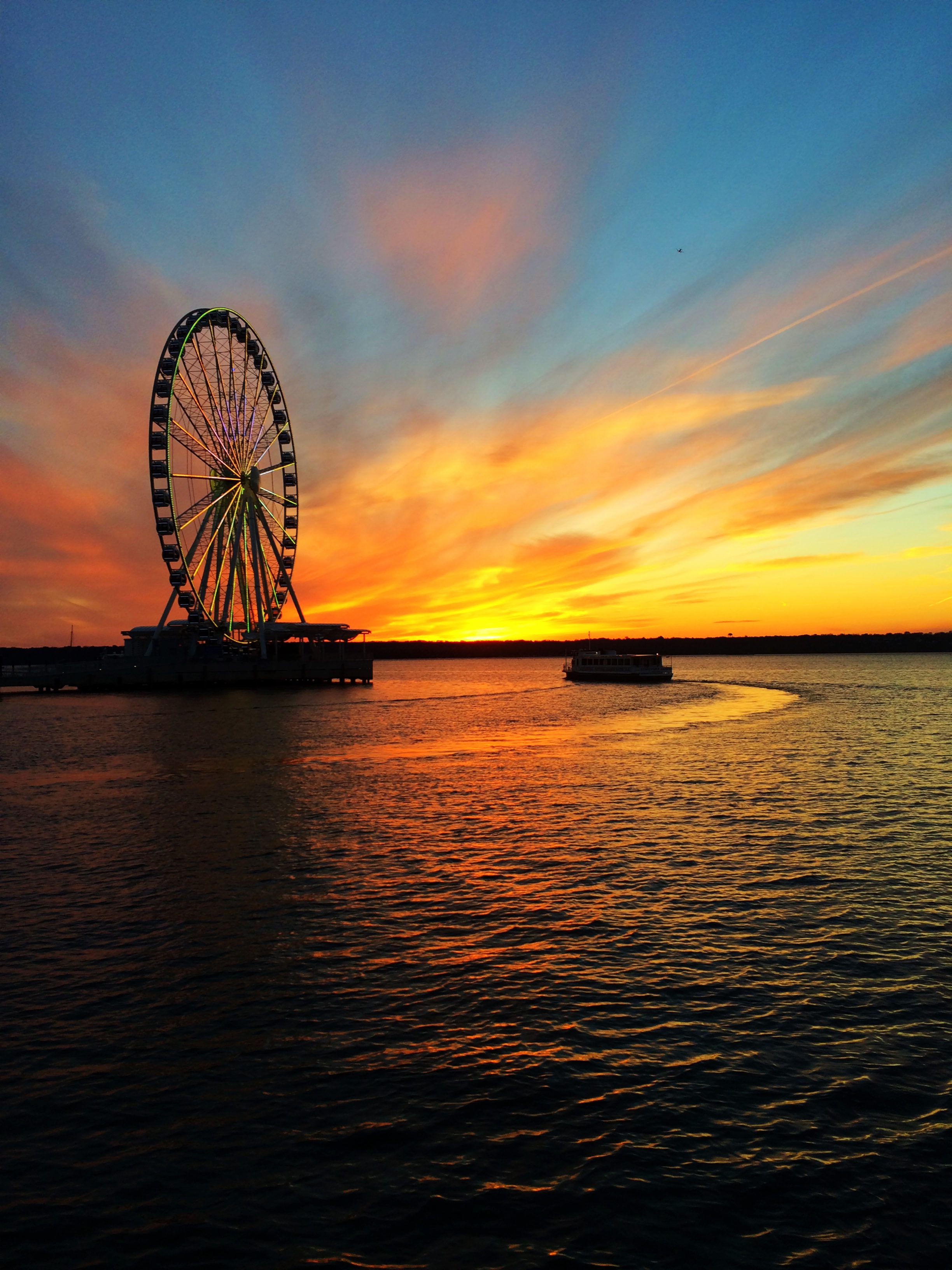 When we arrived at our hotel in National Harbor, Maryland (just across the Potomac from DC), we discovered that our hotel room had a spectacular view of the river…as the sun was setting after a long day of travel. And it’s cold here! Seeing the gorgeous sky, a ferris wheel, and water…my friend and colleague Janis and I looked at each other, pulled on our coats and rushed outside to see if we could get closer, without any rooftop obstructions to take a few pictures before the colors in the sky dissipated.