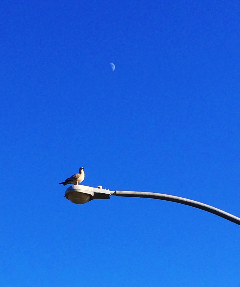 It’s interesting the way the dryness of the west and the blue of the ocean and the brilliant blue sky converge to create near summer-like conditions at the end of November. I looked up and noticed this seagull sitting on a streetlight with the moon in the background.