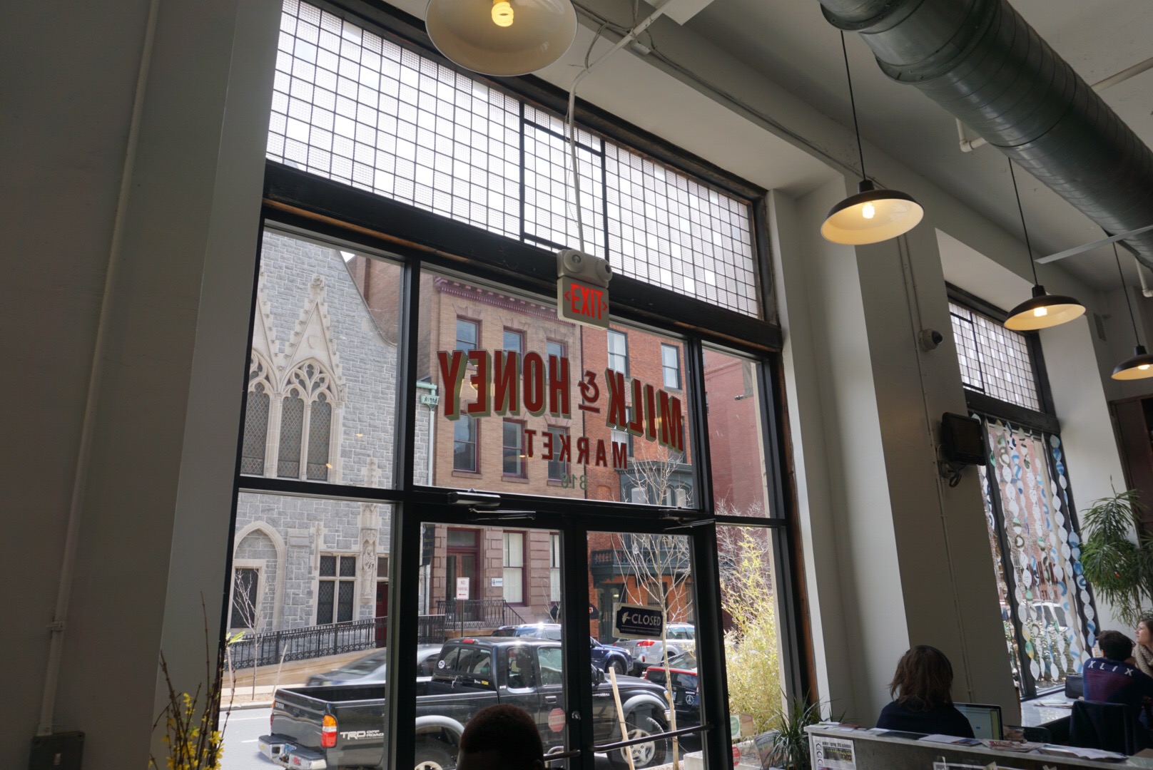 or this from the inside looking out from Milk and Honey in Baltimore. (I like the way the words are reversed since I was photographing from the inside rather than the outside.)