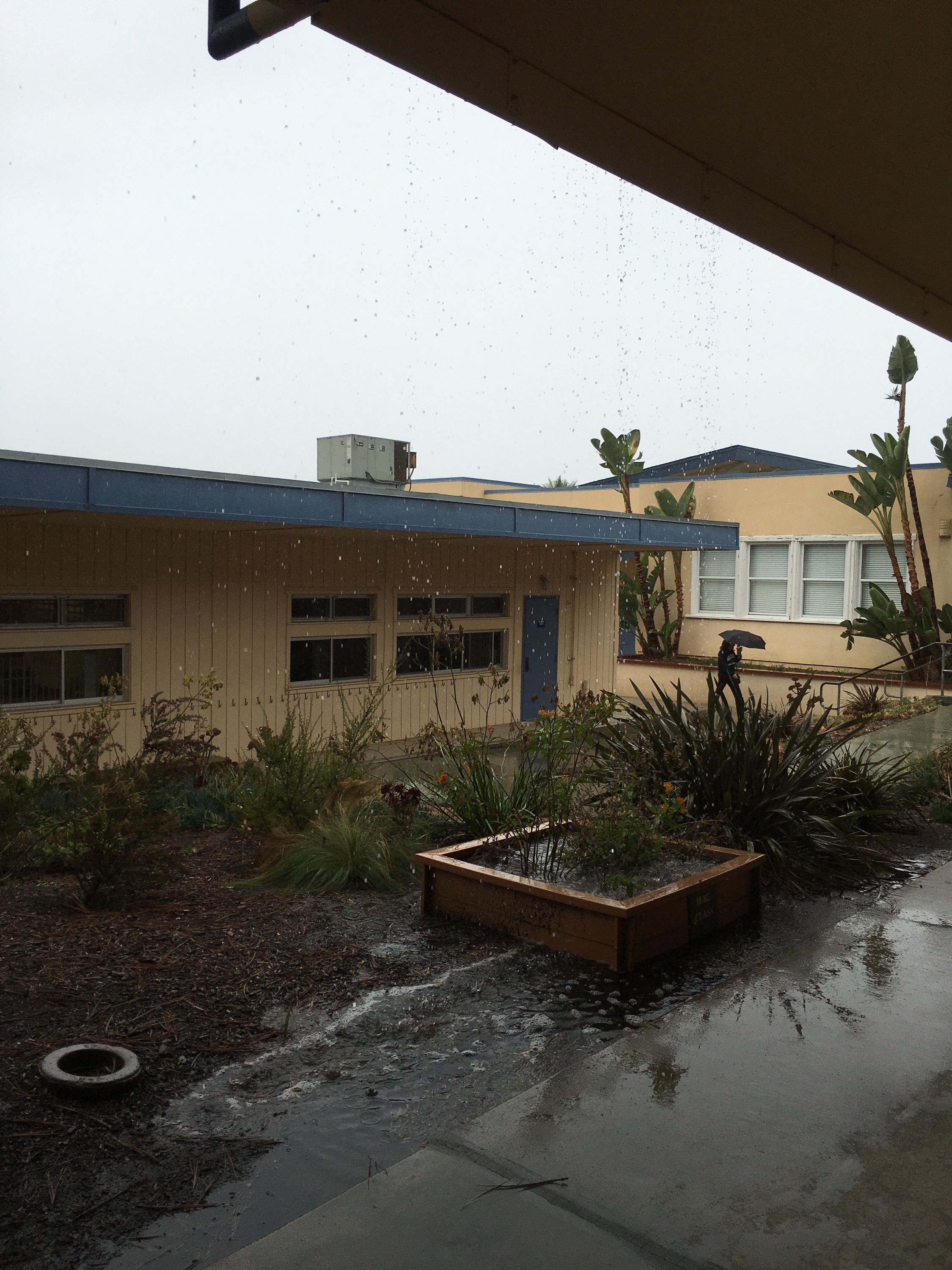 And remembered the deluge of rain on Monday at school–water poured off the roof and the walls.  I have yet to master the art of photographing rain, but I think you can see the water pouring down.