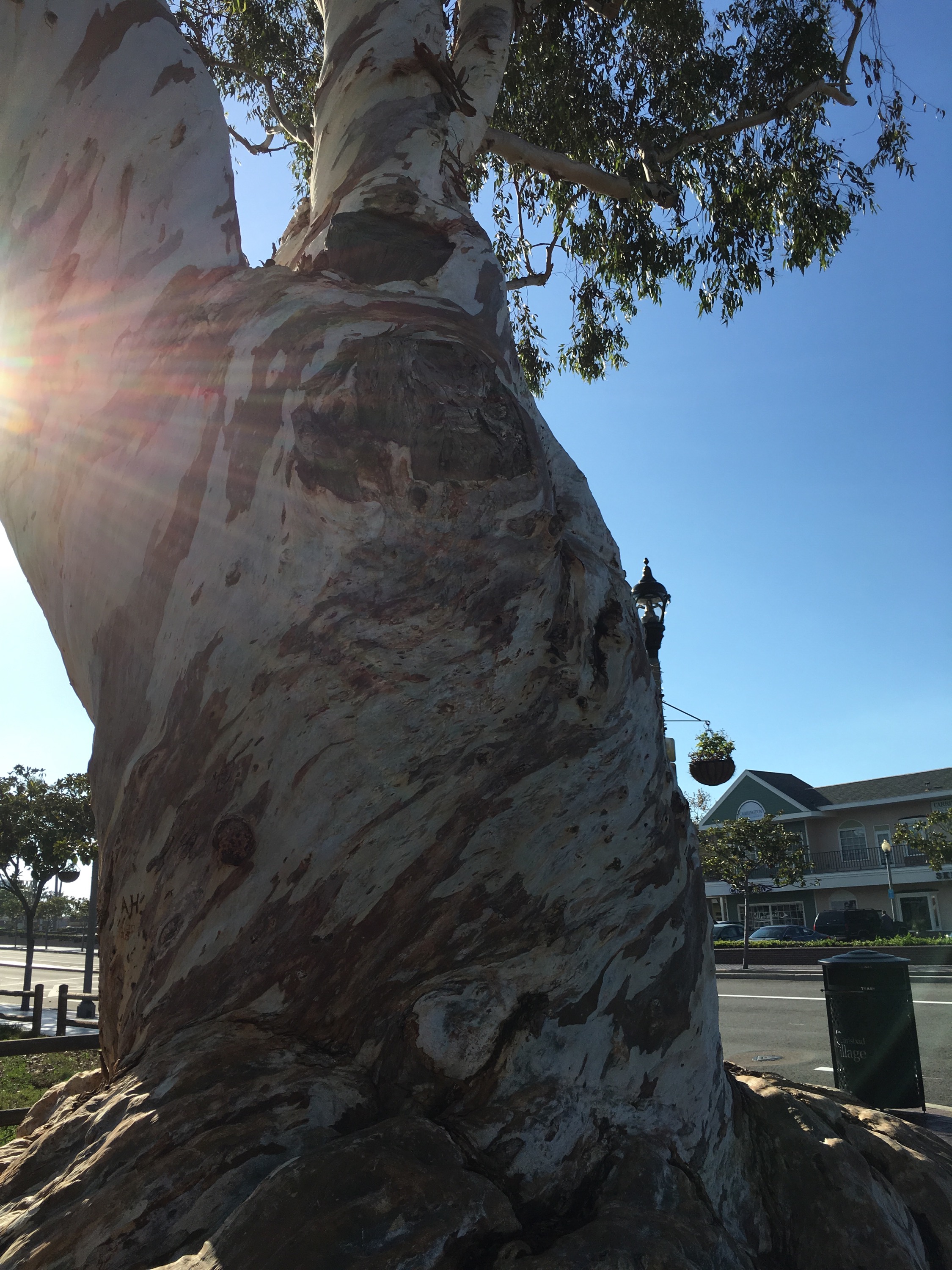 I crossed the street and headed back in the other direction where I had seen another wall mural.  But first I came across this incredible Eucalyptus with a huge trunk, rounded by years, thick and sturdy.  I started to think about the ways our bodies change with time.  And even if we work to stay thin, mature bodies thicken and bulge as time passes.  I always feel like I want to judge my thickness, push it away, hide it…but admiring this incredible tree made me start to rethink my attitudes.  I’m still working to embrace the aging process.