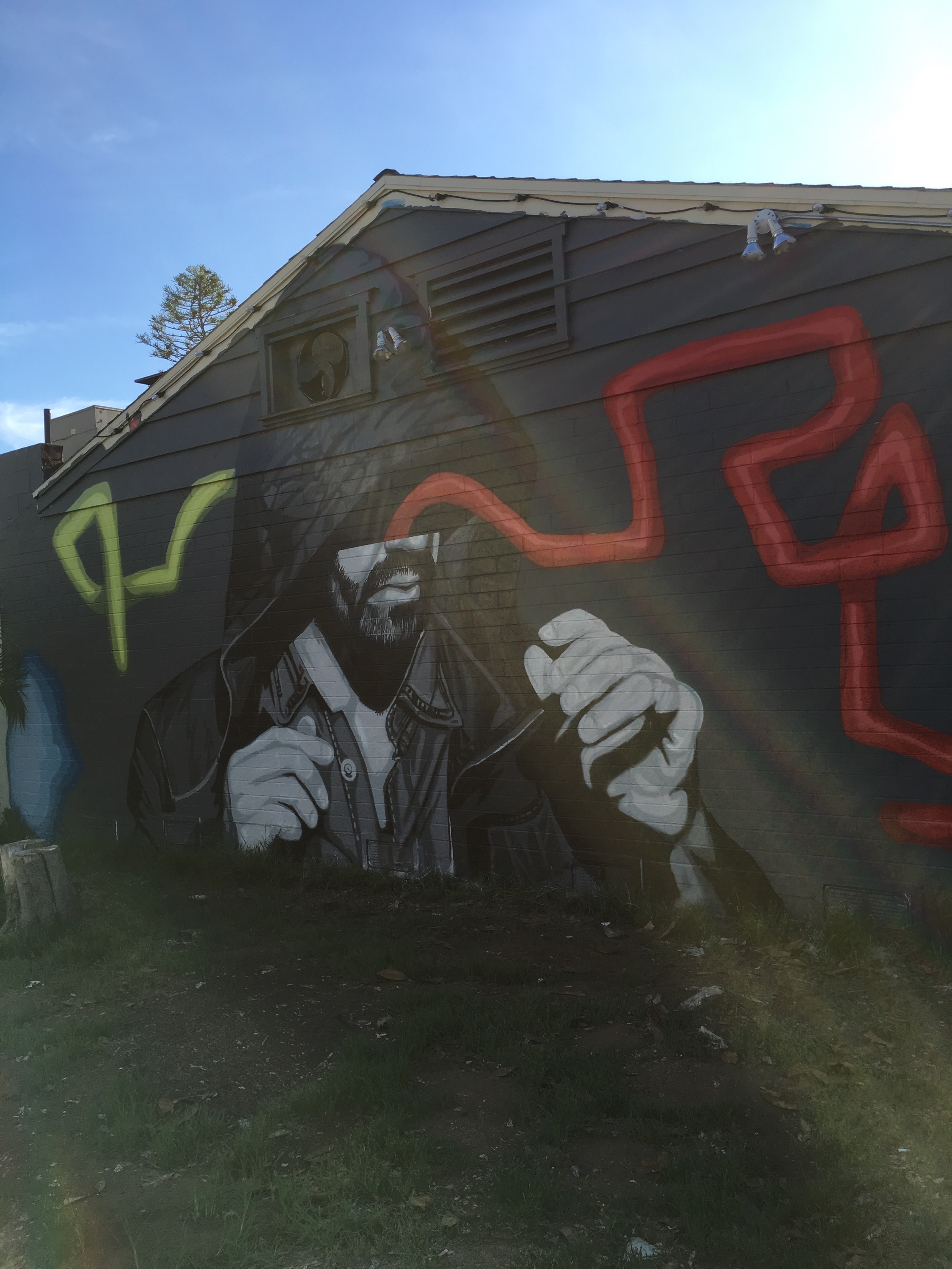 I cut through the parking lot and remembered another painting on the side of the liquor store.  I turned my phone sideways to capture the perspective of wall, liquor store, and parking lot.