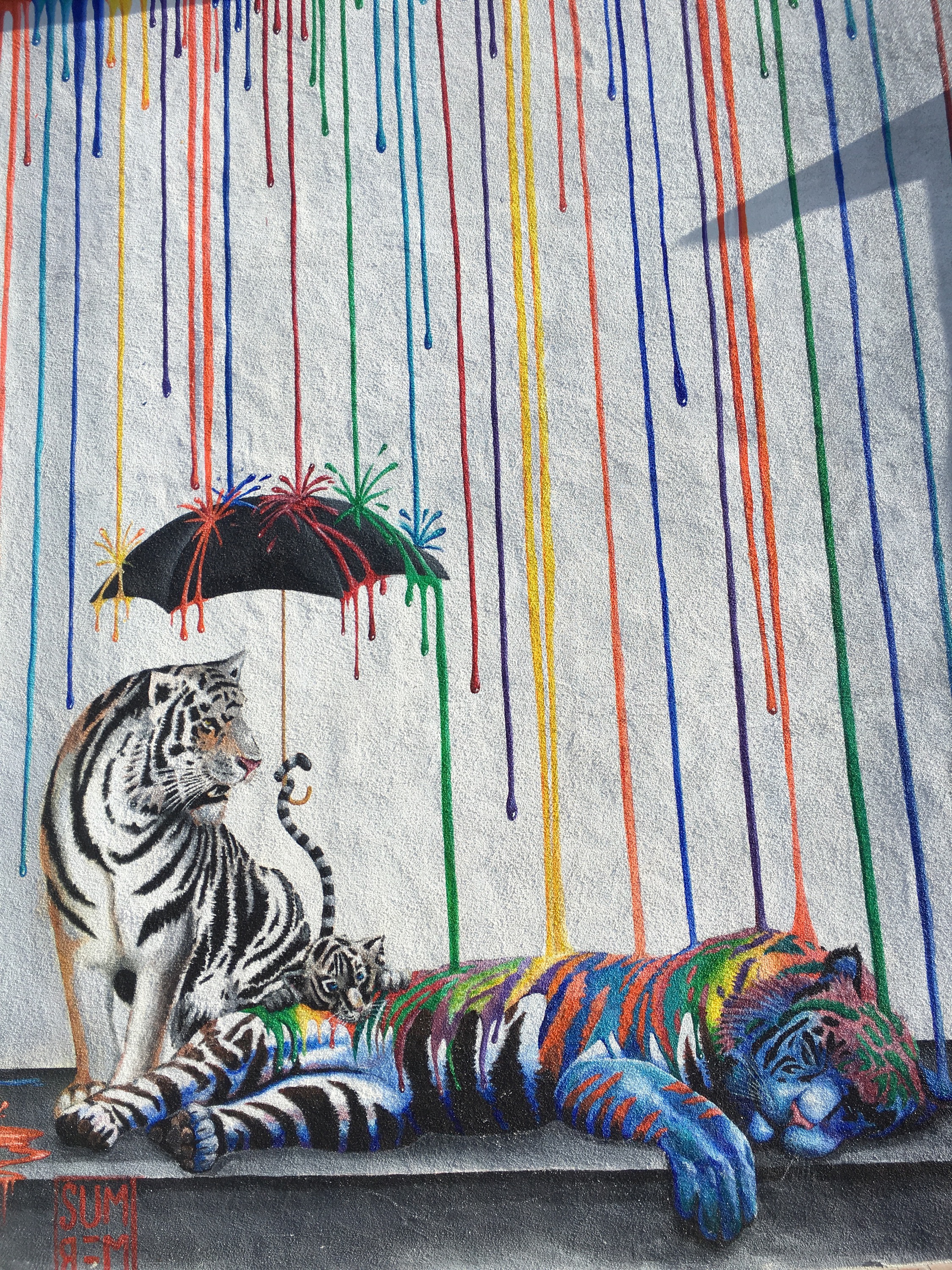 Around the corner from the coffee place, I remembered this wall painting of cats with colors raining down onto them.