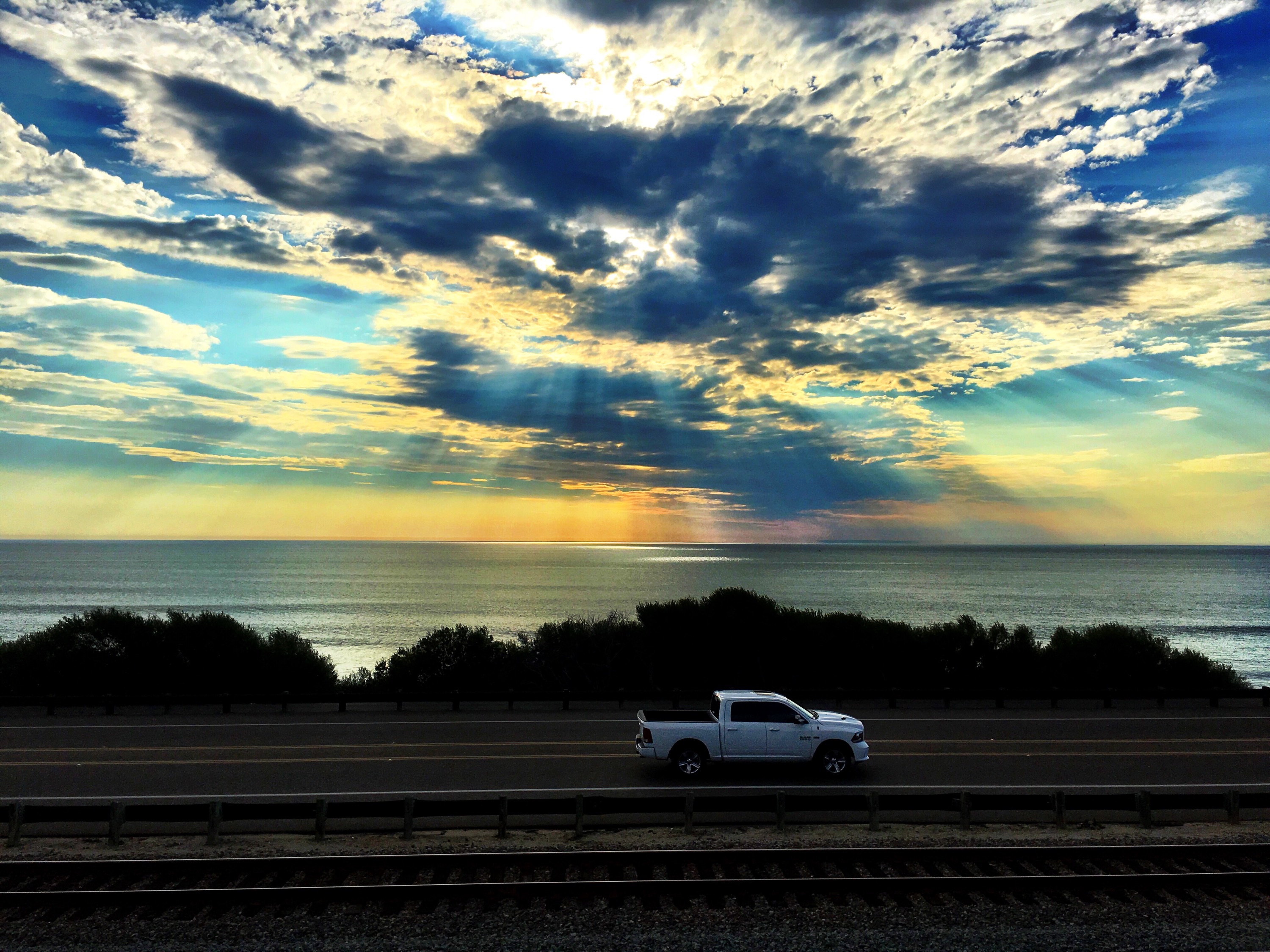 Earlier in the week I couldn’t fight the urge to pull over to the side of the road to capture the beauty of the ocean and the sky on my way home from school.  The sun and the clouds and the sea and the train tracks created the perfect composition as the truck drove by.  (Feels like a perfect truck commercial!)