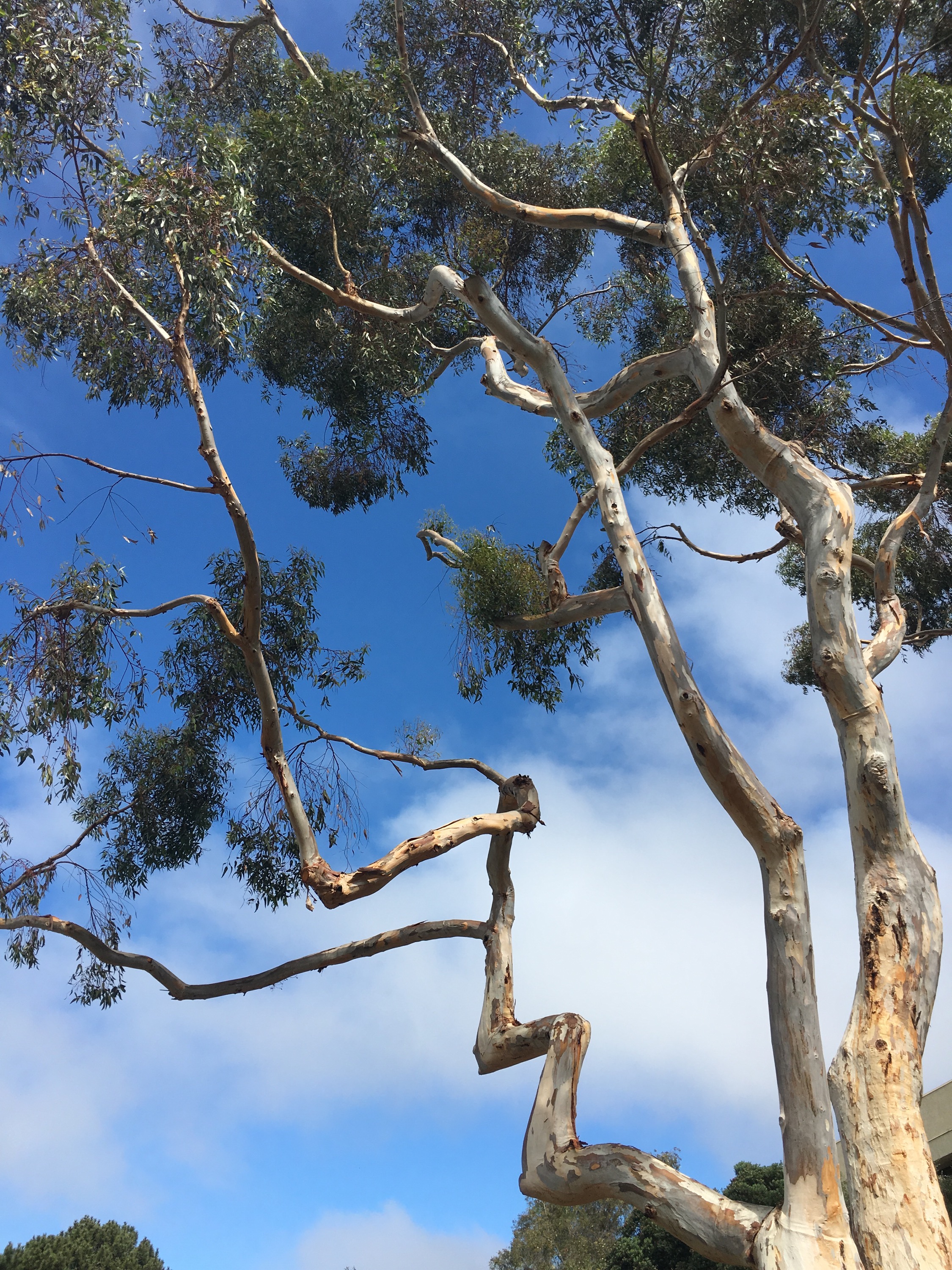 I took the long way to my UCSD office this afternoon, noticing the detailed architecture of the buildings in the distance.  But my detour took me to a patch of mushrooms, a wall of fall-colored ivy…and then I looked up and noticed the angles of this eucalyptus (and a break in the cloudy gloominess of the sky, framing the branches in brilliant blue!).