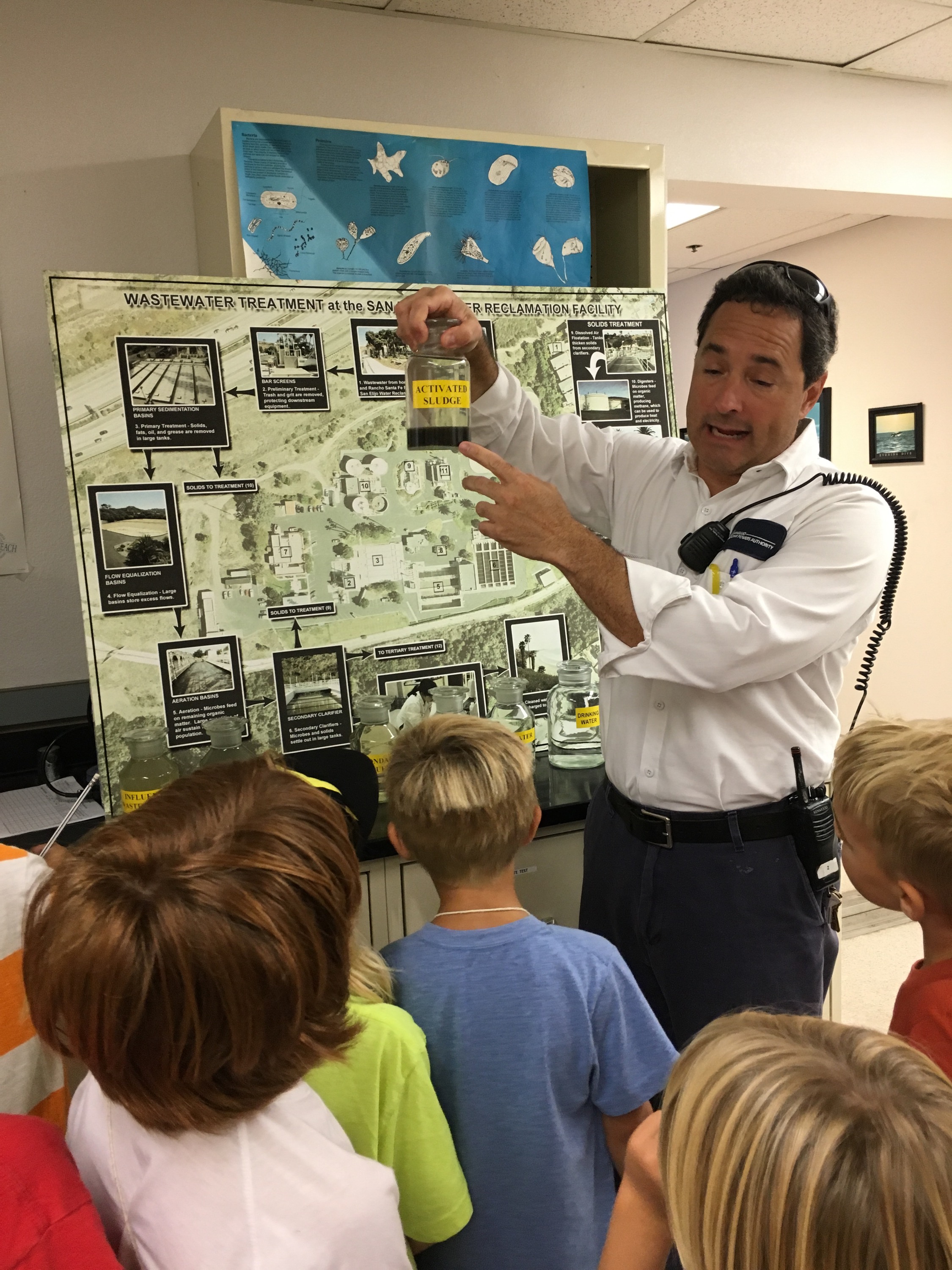 On Thursday, we had the opportunity to take our students to the local waste water treatment plant.  We’ve been studying water (something we don’t have enough of here in San Diego!) and have a parent in our class who happens to be the deputy mayor in our community.  She was eager to make the connection between the study of the properties of water and the water cycle and the municipal responsibilities of getting water to our taps and then treated as the water heads back out into nature’s cycle.  So when she asked if we’d like to have her arrange a field trip to the water treatment plant just a couple of miles away, we were eager to go.