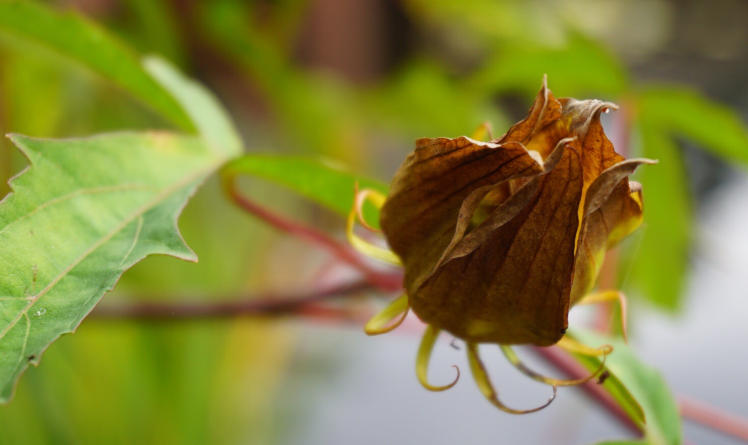 A visit to the Huntsville Botanical Gardens brought me eye to eye with this wonderful Halloween blossom of orangish and black!  (I have no idea what its true name is, but I love the slightly crumpled look of it.)