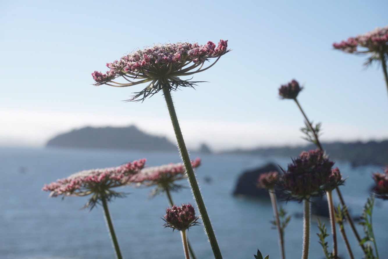 Beaches in northern CA are nothing like beaches here. First, the weather is cold–highs into the low and mid 60s in late July! There are lots of sand dunes and breathtaking cliffs. This cliff near Trinidad, CA also featured wildflowers, a treat after a harrowing and twisty turny trip down a bumpy and often one-laned road to access it. You can see the thick fog in the distance…there was no sunset on this evening as we drove back into the fog bank to find our lodging.