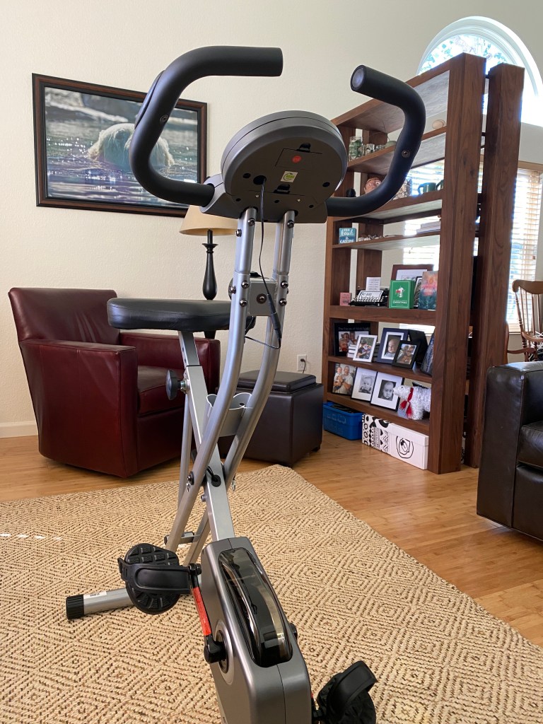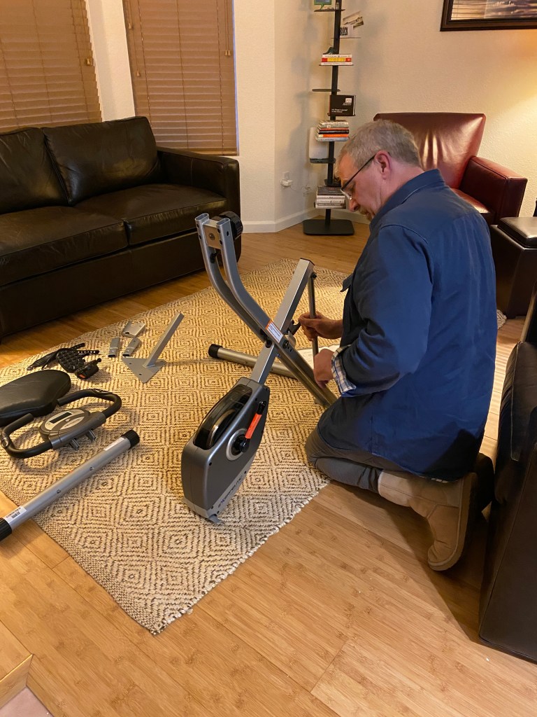 My role when it comes to putting things together is to organize the pieces, get rid of the packaging, and prepare to hand out the nuts and bolts and screws and pieces. And after about an hour, voila, we now have a stationary bike!