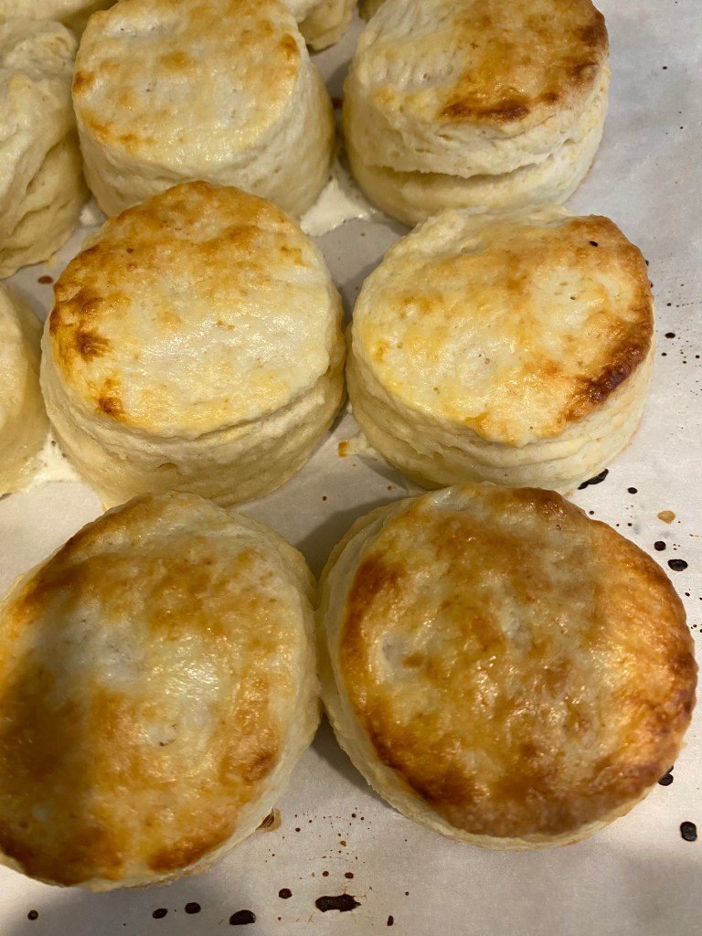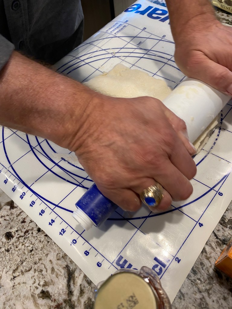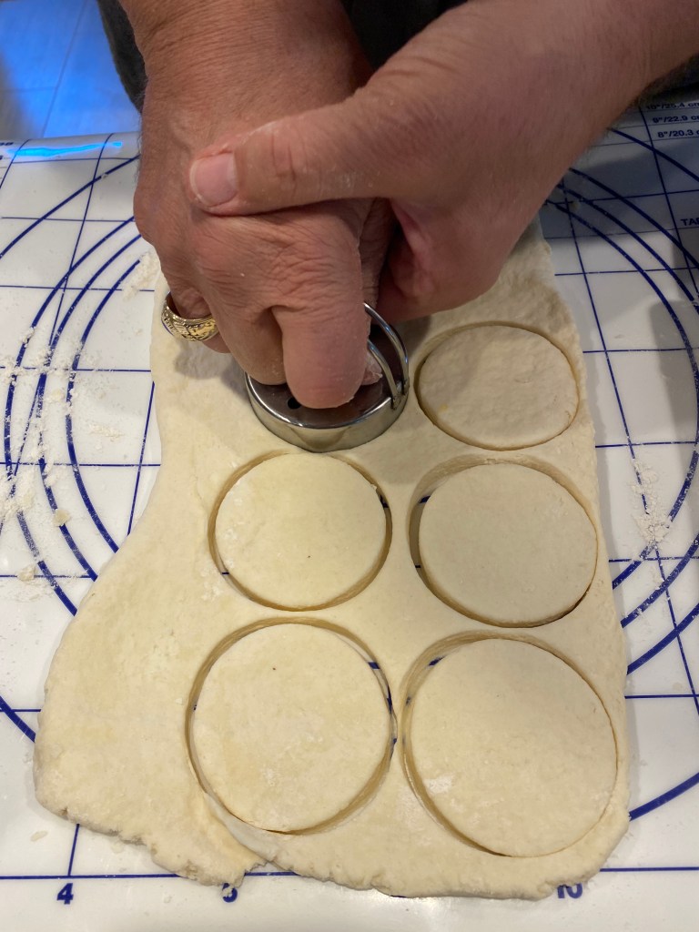 He’s learned this folding and rolling technique that creates space between the layers of the biscuit that contributes to the light and flaky texture. When it is rolled just right, he starts the cutting. with the biscuit cutter we bought on a trip to Nashville (where the biscuits are good)!
