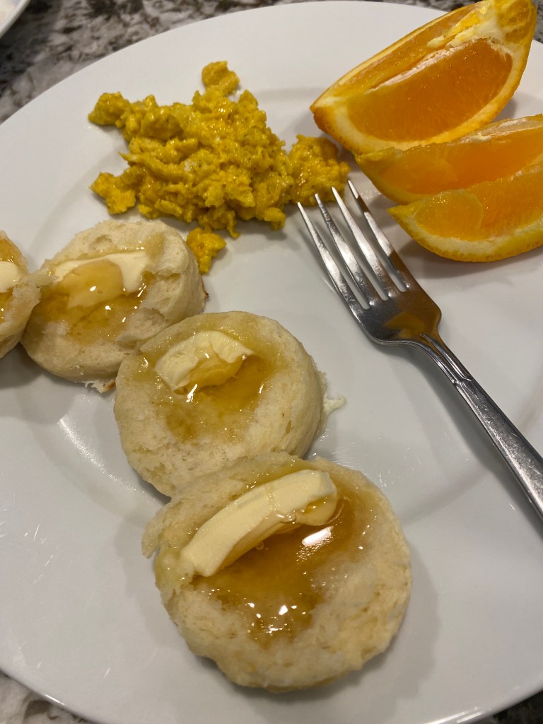 And to balance out this decadence, scrambled eggs with cheese and turmeric and some orange slices round out the breakfast plate.