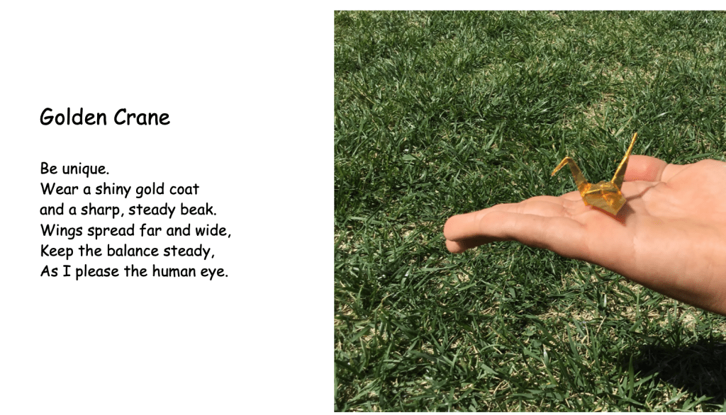 But this year, as we all know, is different. I made a short video of myself explaining the challenge. I sent my students out around their homes today in search of “tiny perfect things.” I asked them to pick one of those things and create a list of 10 great words related to one of the tiny perfect things…and then introduced a mentor text poem.