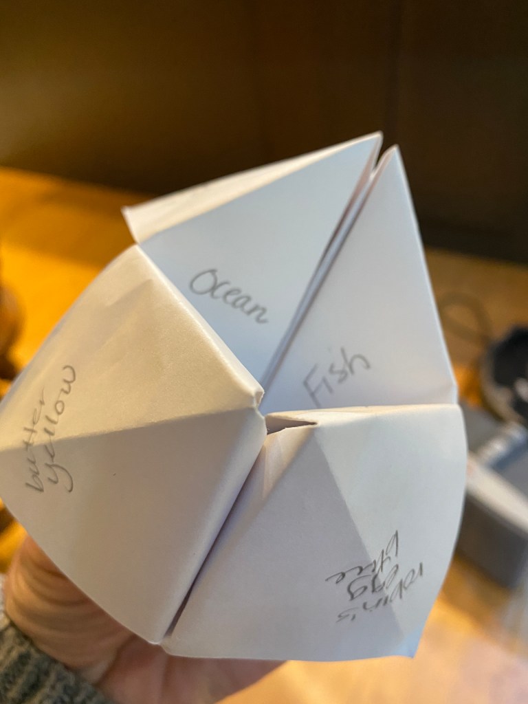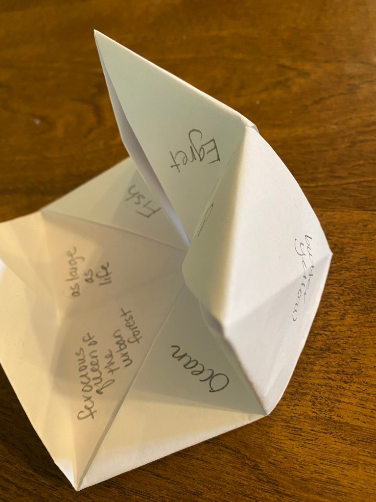 Earlier this week I read a post by a virtual friend, NomadWarMachine, who described her path to transforming the origami fortune teller of our youth into what she called a line of thought-une teller. I immediately knew that this would be a great activity to modify for my students as a culmination of our month of poetry writing.