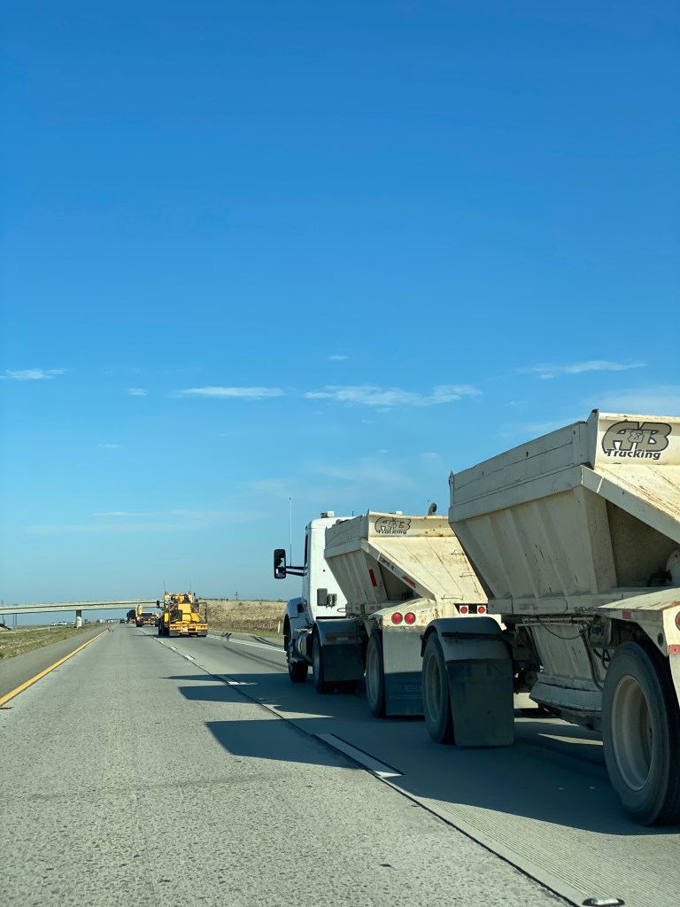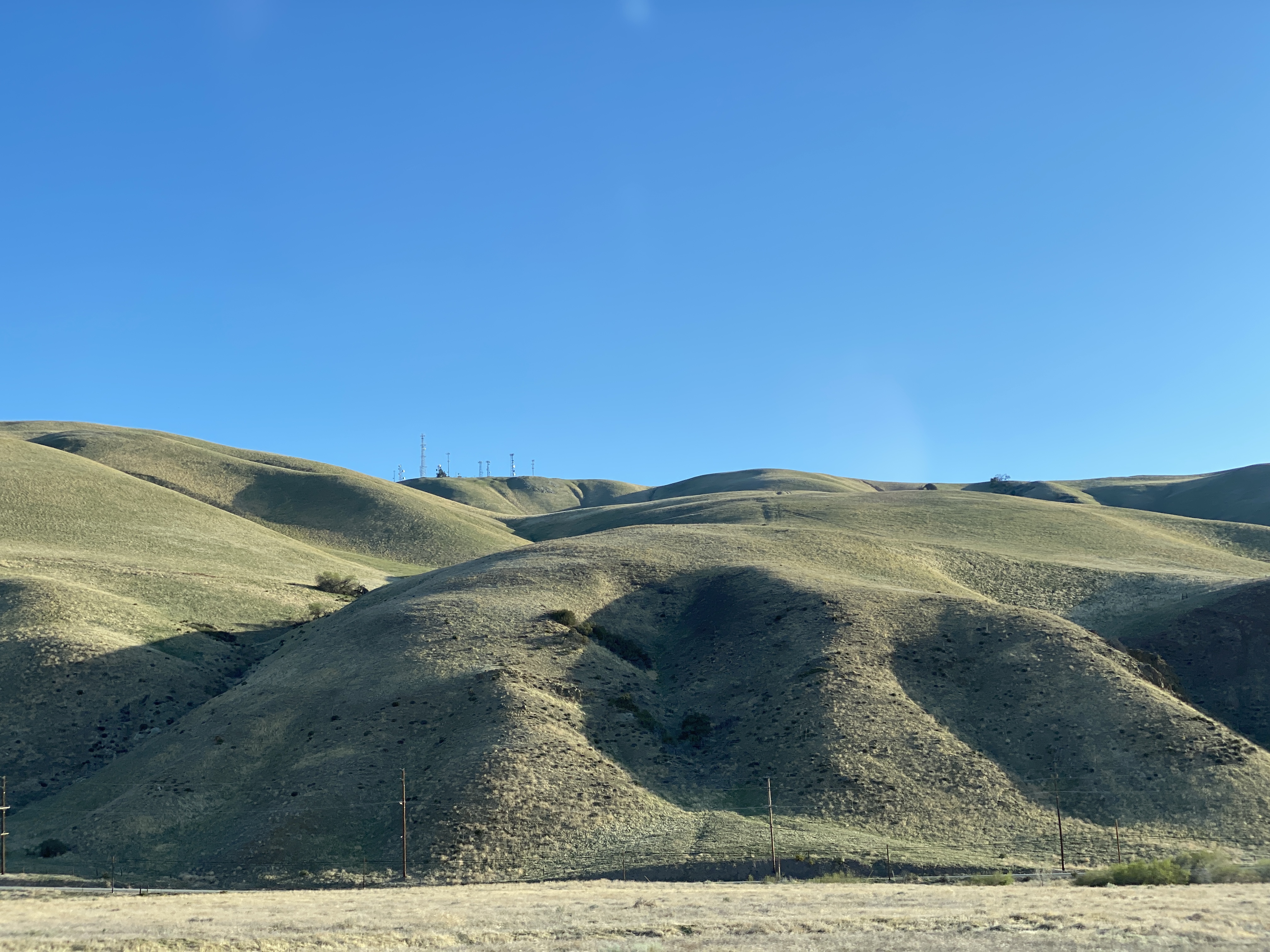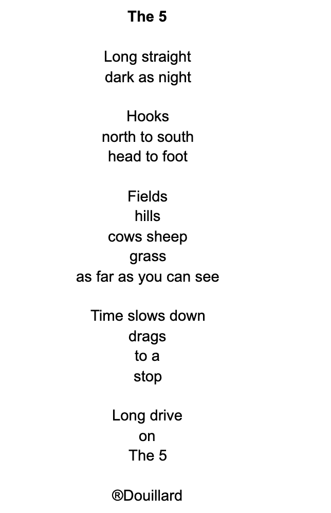 If you know the state of California, you’re aware it is a long state connected by a freeway affectionately called The 5. After hours and hours in the car yesterday, I decided to write a poem…using only one syllable words…in hopes of capturing that long drive up that never-ending ribbon of road. (With a few photos for visual impact–all taken from the passenger side car window.)