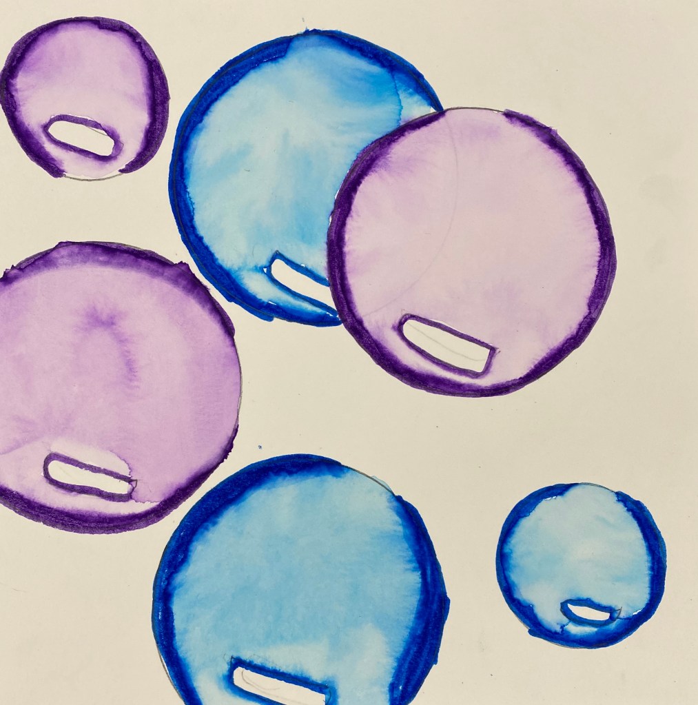 To complement the poetry and the elusive, temporary soap bubbles, we got out paper, pencils, water-based markers and some water and created bubbles…as art! Each artist created their own composition, tracing round shapes, adding a space where a light source reflected off each bubble. Then they added marker and finally, using just water and a paint brush, urged the marker to follow the water, creating beautiful dimensional bubbles on watercolor paper.