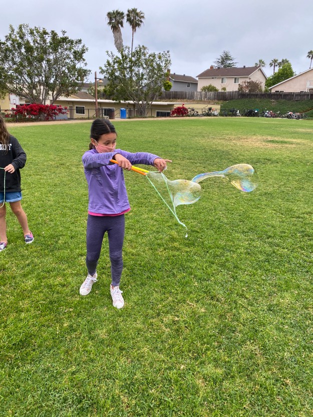 In spite of warning students that making these bubbles would take patience and experimentation, there was plenty of initial whining that “it’s not working!” I reminded them to keep trying. And then it happened…the first child experienced success! Like wildfire, bubbles emerged, filling the air with irridescent spheres.
