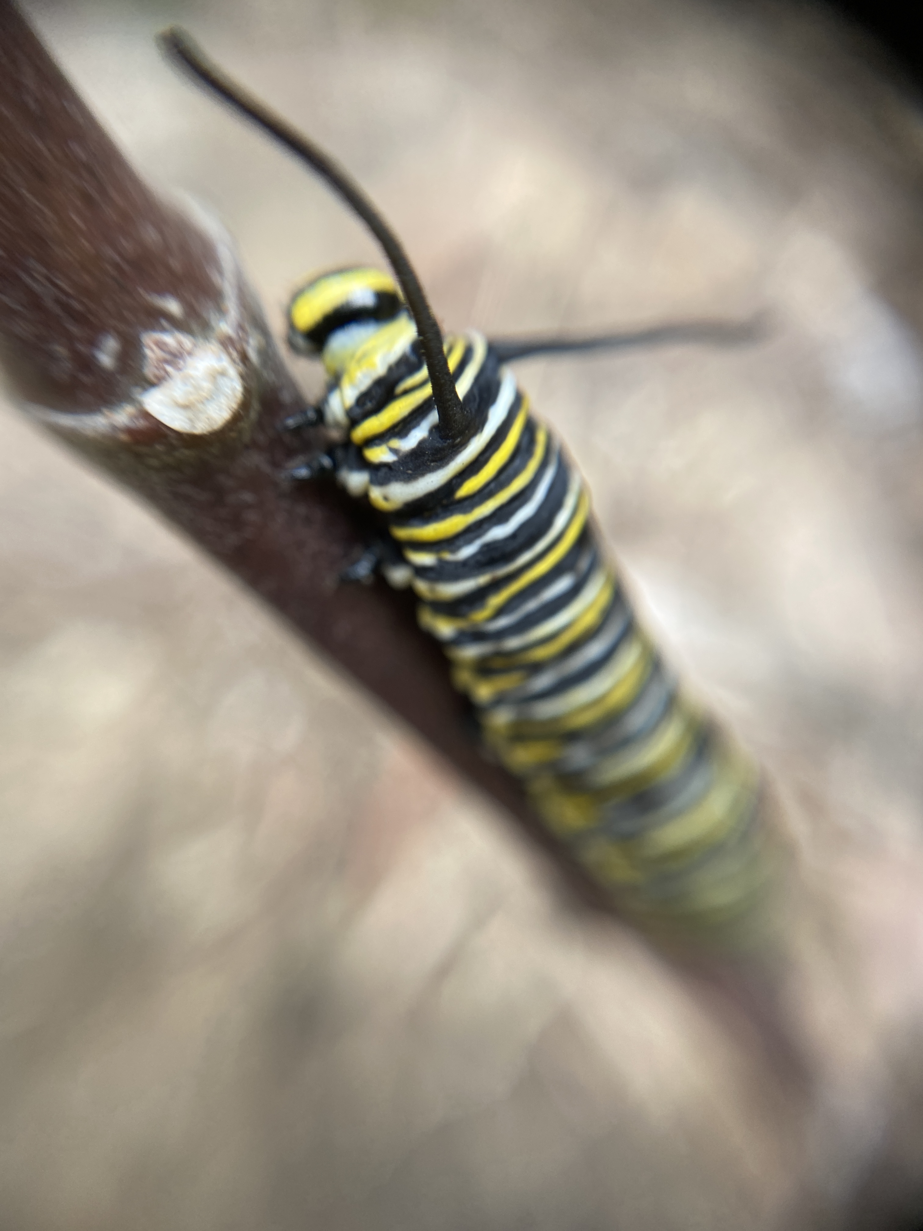 During Tuesday’s lunch break I decided to attach the macro lens to my phone and head out into the backyard in search of a photo subject. The milkweed is looking quite sickly. There are a few flowers, but the leaves have been stripped clean. Upon close examination, I did find a caterpillar–the monarch variety–cruising the stripped branches. I leaned in, took a deep breath, and held as steady as possible to snap a few photos of the yellow, white, and black crawling creature. It was a pretty big one, so I ended up with a head shot rather than a full body portrait.