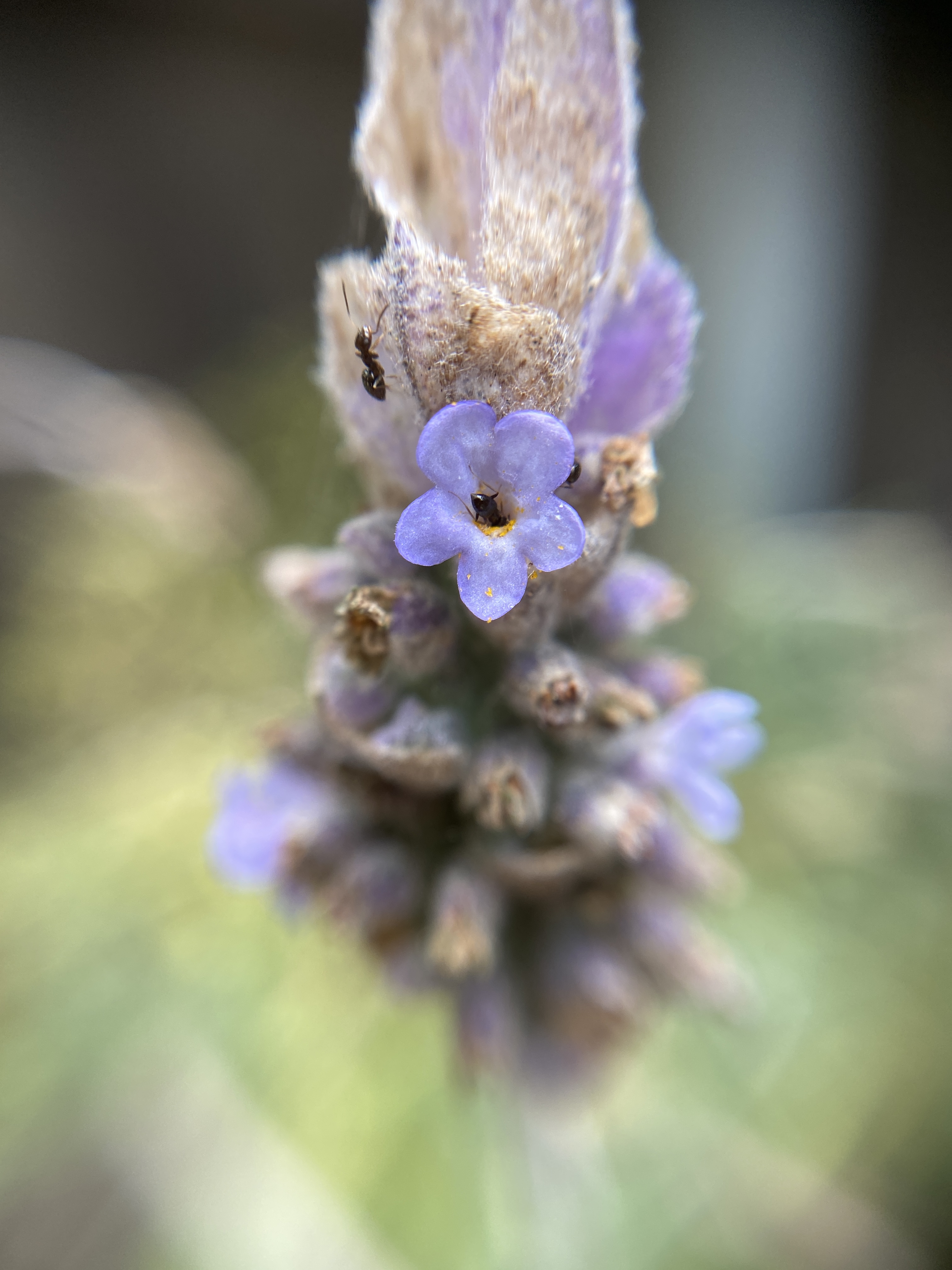 Then I turned my attention to the lavender. I love the way that lavender has tiny blossoms that make up the bloom. I aimed the macro lens at the individual blossom–and then I saw them! The tiniest ants were crawling in and out of the blossom. I moved the lens away and looked closely. I could make out the tiny ants, just barely, without the lens. I snapped a few different shots of the tiny ants exploring the blossom and then my questions started emerging. Are these ants pollinators? Do they help or hurt the lavender? What about these tiny ants–are they a different species than the regular ants I’m used to seeing, just smaller?
