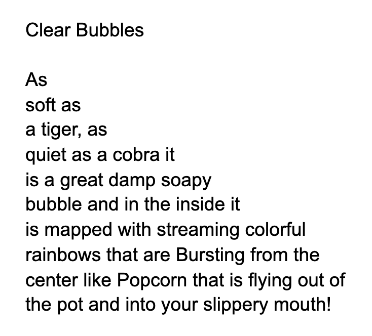 These young scientists are also prolific readers and writers, so after studying Valerie Worth’s short poem, Soap Bubbles, we created a list of bubble words and a list of potential bubble metaphors and then set the magic 7-minute writing timer and started writing. Like bubbles, colorful, delicate, evocative poems floated up, emerging from the points of students’ pencils.