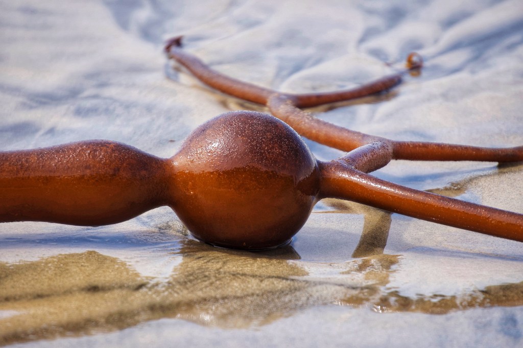 Giant kelp, macrocystis pyrifera, is a common sight on our beaches. But bull kelp, with enormous floats the size of softballs or larger is less common. This amber algae is native to our shoreline and is home to many fish and other sea life. And when it washes up on the shore, it becomes a favorite subject for a still life photo. There are no bad months for beach walking and March just happened to be the month when I came across a bull kelp still life opportunity on my favorite walking beach.