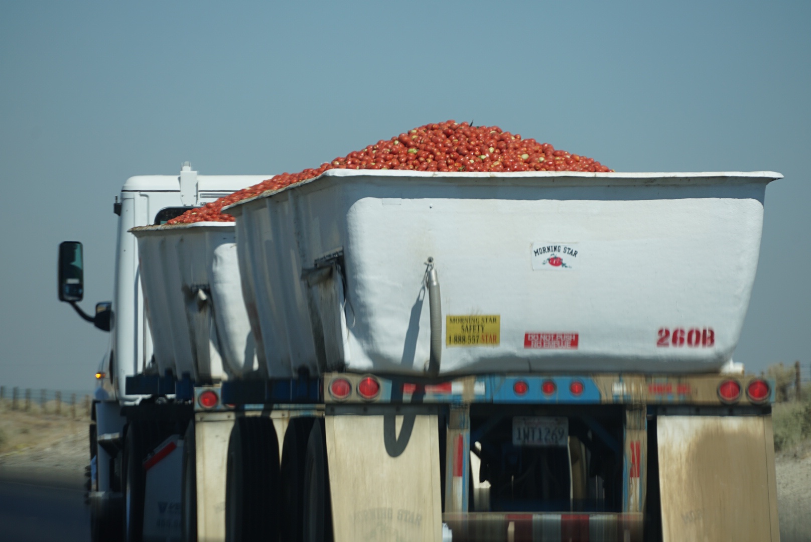 In August we made that long, seemingly endless trek up I-5 through the central valley to visit family in the Bay Area. In the summer tomato trucks are a usual sight. These trucks always remind me of my dad–a person who loved big equipment, driving, agriculture and farming, and had this weird wish to drive tomato trucks. I have gotten in the habit of taking photos of these trucks through the window as we drive up the 5, sometimes sending them to my dad, just for fun. This year, just a few weeks after his death, taking these photos made me feel close to my dad. I would notice the rich red of the tomato haul visible in the northbound trucks, bring them into focus as we approached, and then try again as we passed truck after truck after truck. Southbound trucks were empty, heading back to pick up another load and make that round trip again.