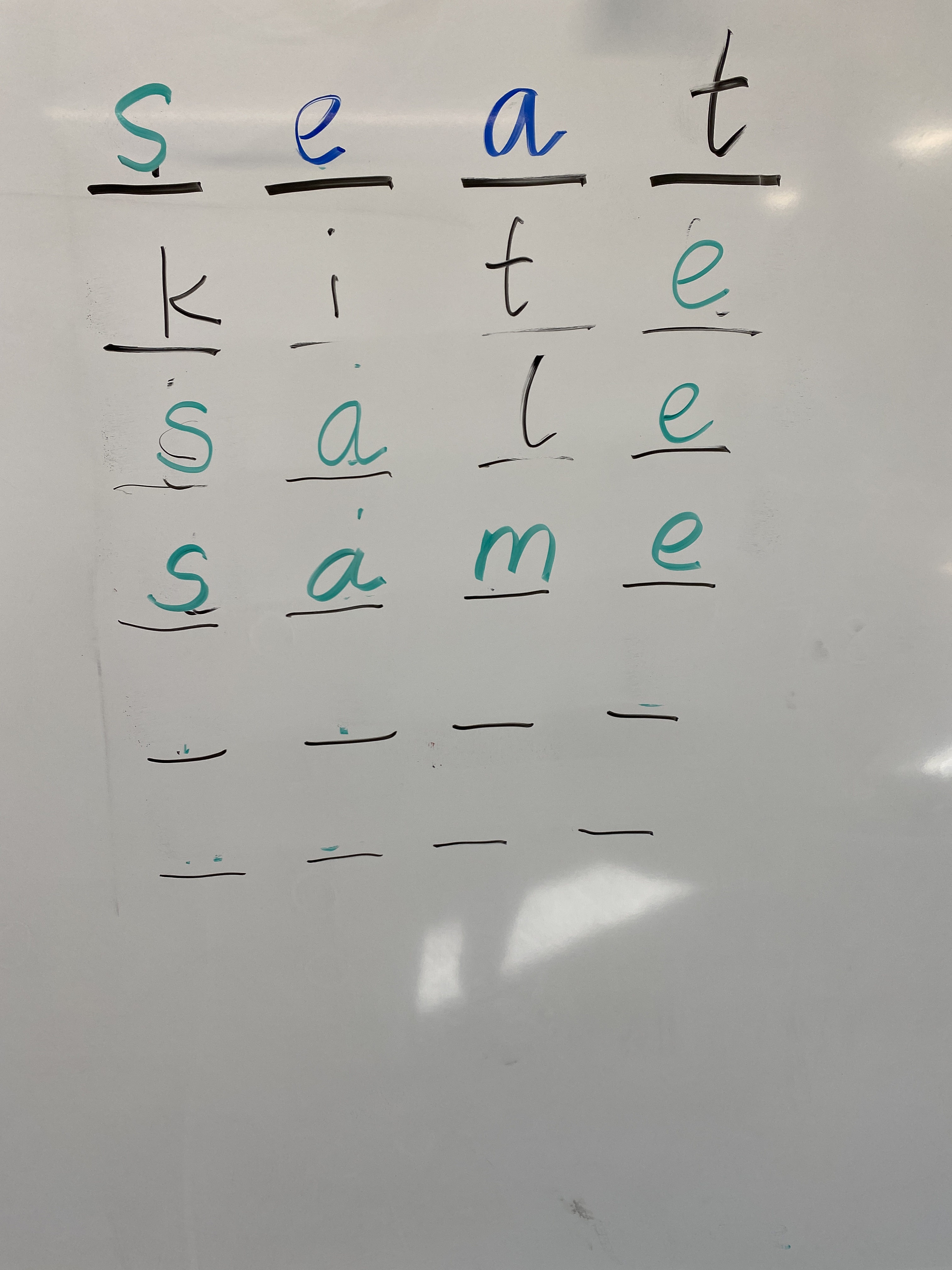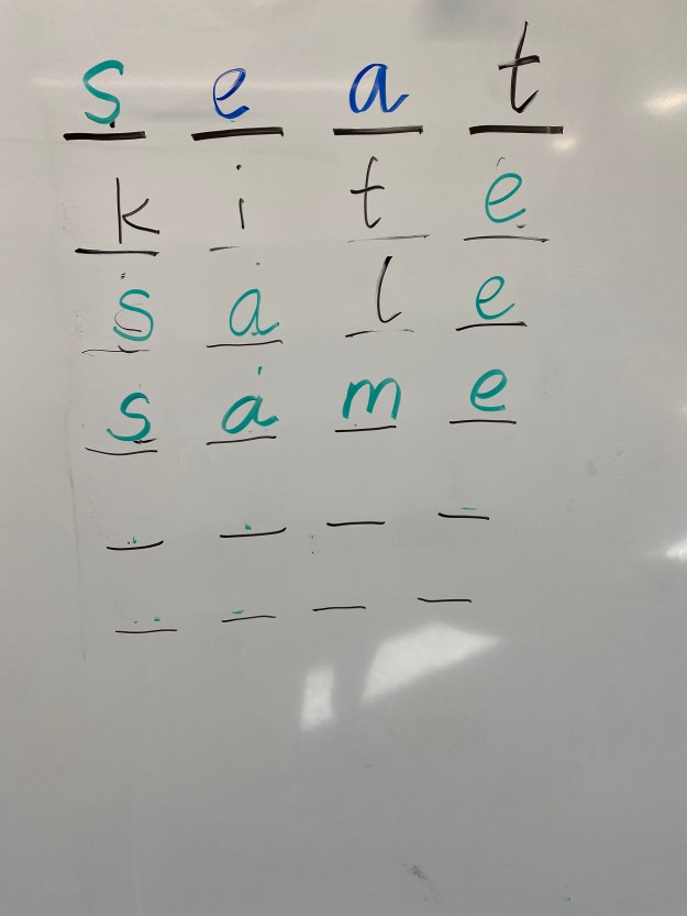 So…I introduced this new game to my students. I drew 4 lines to represent the 4 letters in the word I was thinking of. I grabbed a black, blue, and green white-board marker announcing that letters in black were not in the word, blue meant the letter was correct but in the wrong place, and green meant the letter was correct and in the right place. I wasn’t sure how this game would work out–or if it would even make sense to my students. But…it was great! Students loved this process–and caught right on. I could hear them telling each other whether a guess was a good one (“…we already know there is not an “s” or “h” in the word…) and the game definitely caught their attention. We played several rounds today…and I remembered to take a photo of the last one.