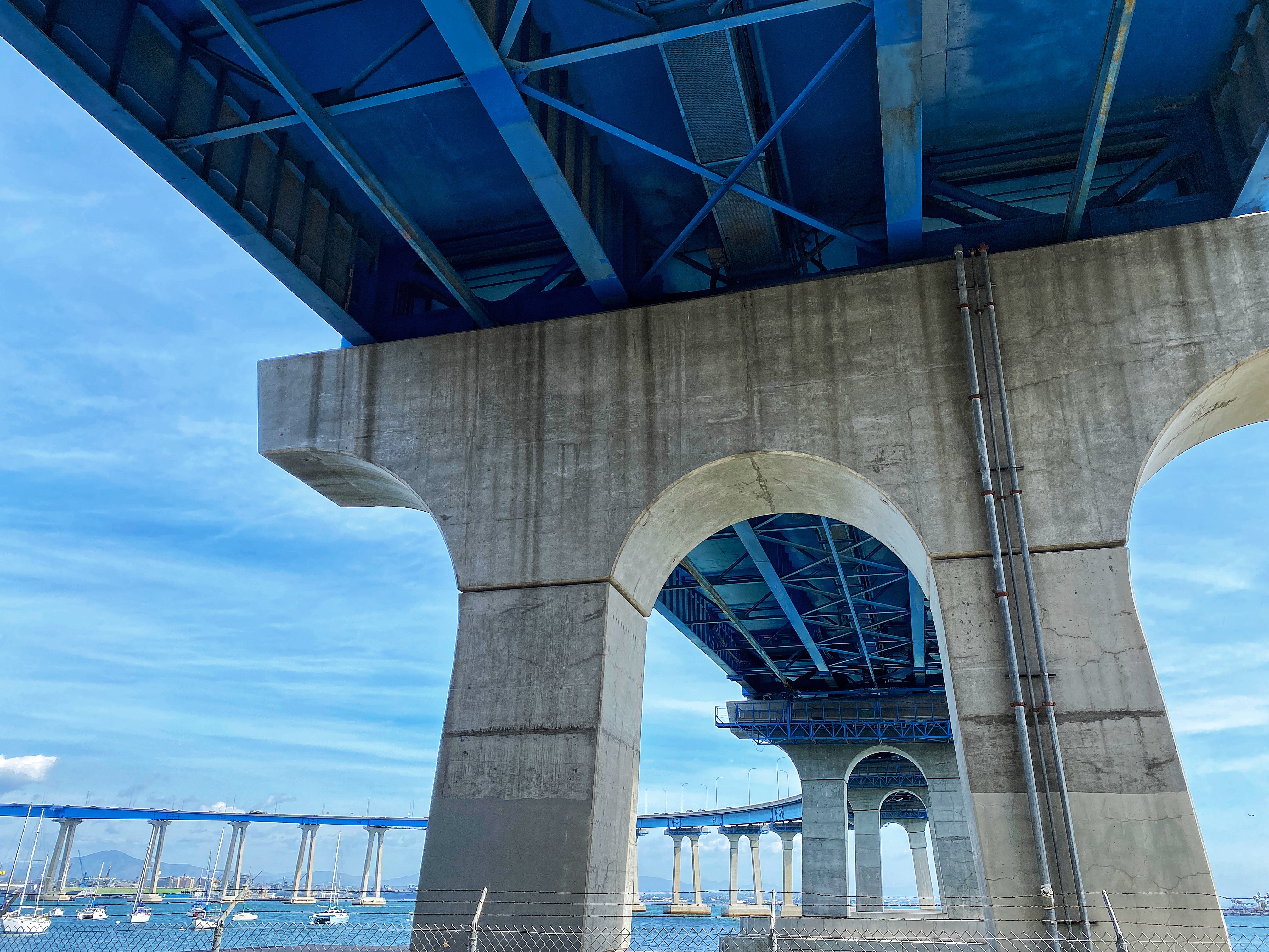 Valentine’s Day happened to fall on the first weekend of our February break in 2021, so to celebrate we decided to be tourists in our own town! We drove downtown, masked up, and took the ferry across the bay to Coronado. The Coronado Bay Bridge is an iconic landmark here and I couldn’t resist photographing from below, especially since the third graders in my class happened to be studying bridges at that time. I love the perspective that shows some of the under-supports along with the sweeping curve of the roadway with the boats, bay, and clouds on view too.