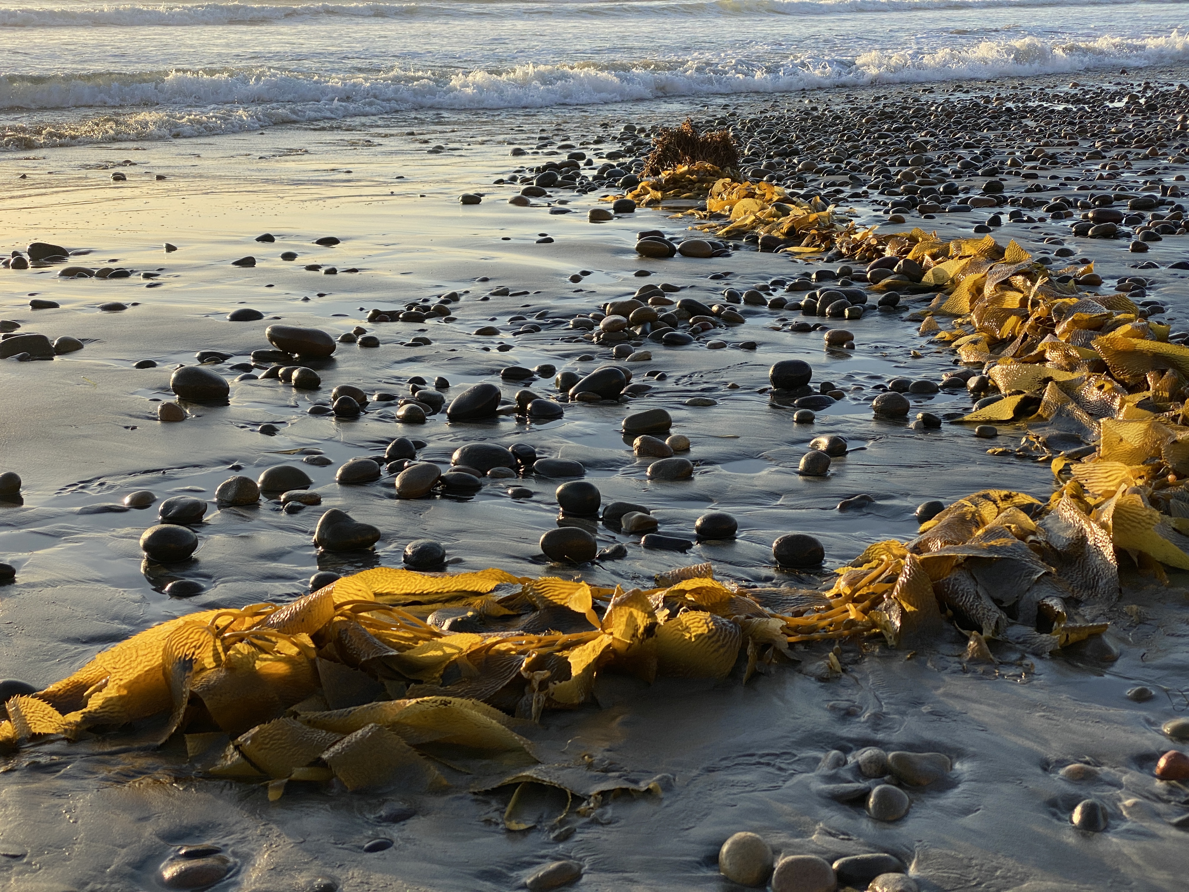 Love the light coming through the kelp (?) and the arc of it along the beach–like a tide artifact!