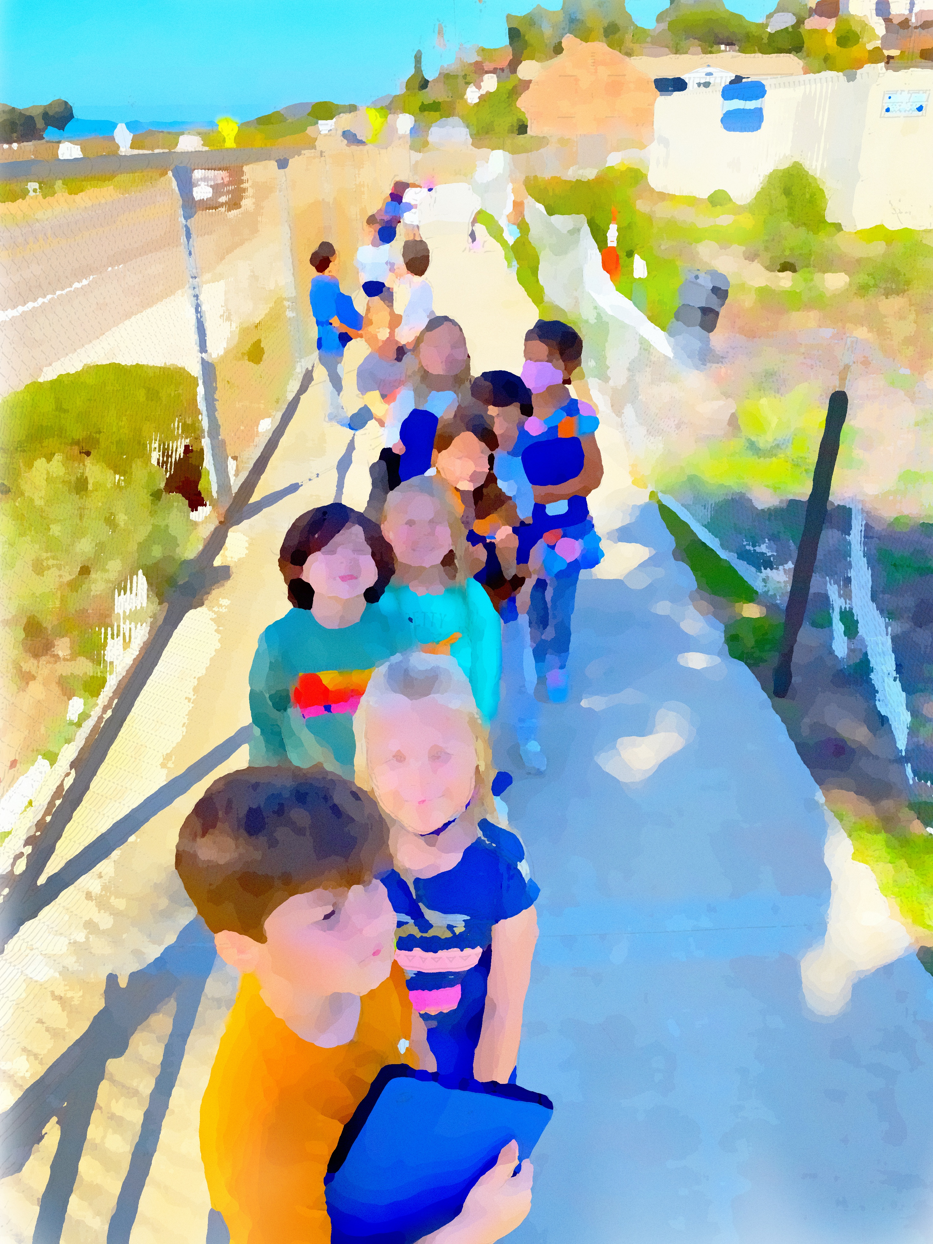 There’s nothing like watching first graders take photos. They have no hesitation about laying on the ground, crawling under a plant, or taking an angle that I would never have imagined. As we walked back from the garden, we made a few stops to snap a couple of extra photos of some California golden poppies growing along the fenceline, some other wildflowers, and a lizard doing some sunbathing. And of course, I couldn’t resist a bird’s eye view shot of the class on our way back.