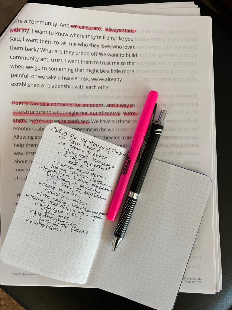 On this last day of April, Sarah over at Ethical ELA has invited us to claim the title writer or poet modeled on the poetry collection I Sing: The Body edited by René Saldaña, Jr. The collection of poems thread struggle and celebration within what we are told and what we believe about ourselves. The poems uncover memory and anger and hope. I decided to explore the identity of writer in today’s poem.