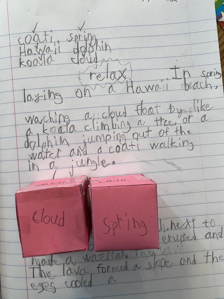 Today we built poetry dice. Using a generic fold-a-cube pattern on cardstock, students cut out a flattened cube, wrote their favorite 12 wild words (they made 2 dice), and then folded and taped their finished cubes together. Then came the best part–playing with words and poetry. They rolled their dice, recording the 6 words they rolled in their notebooks. Then they considered those words, how they related (or didn’t) to each other, and wrote poetry. As a teacher of writing, there is nothing more satisfying than watching students transform into confident poets, easily playing with words, experimenting with form and ideas, and bursting to share their poems with me and their classmates.