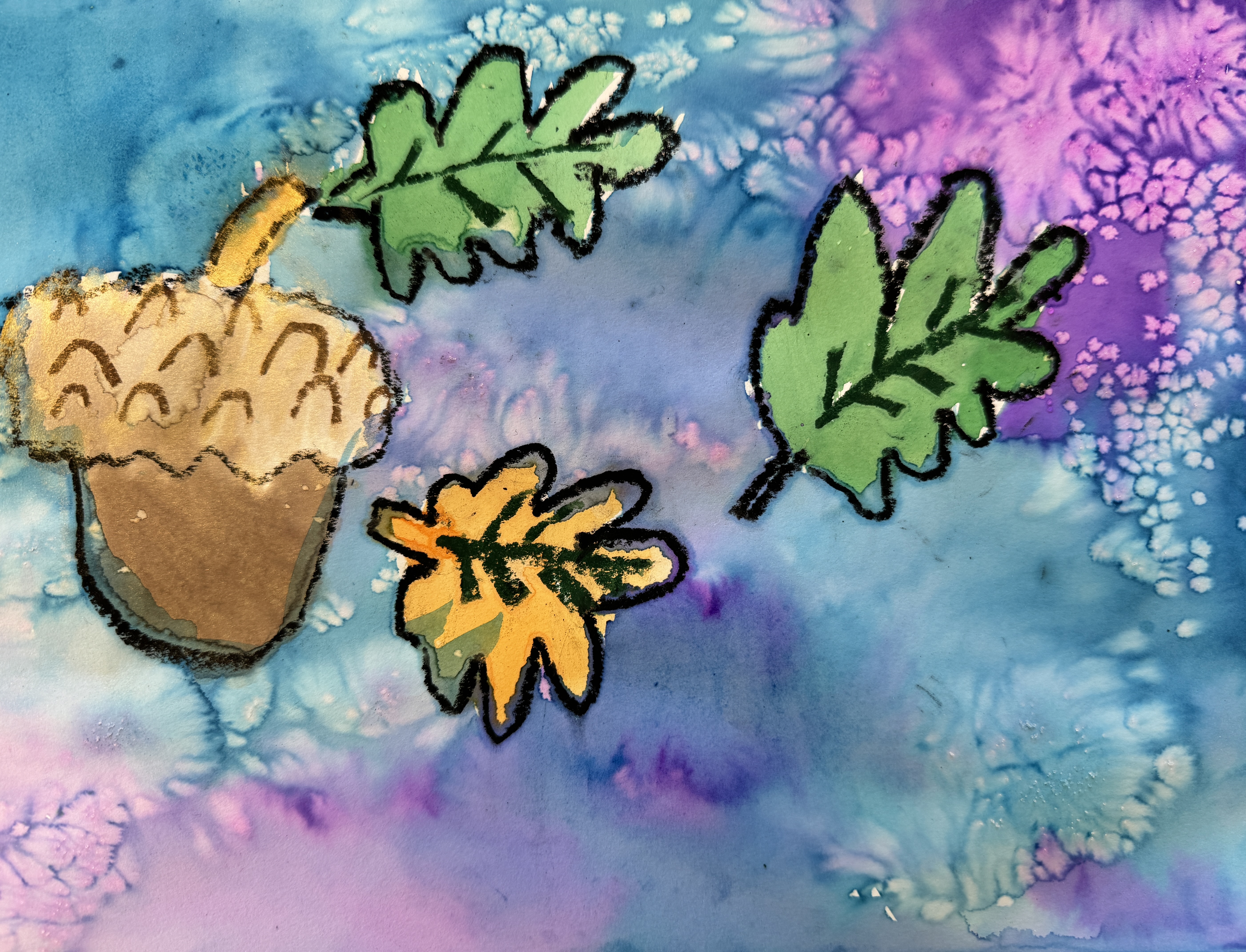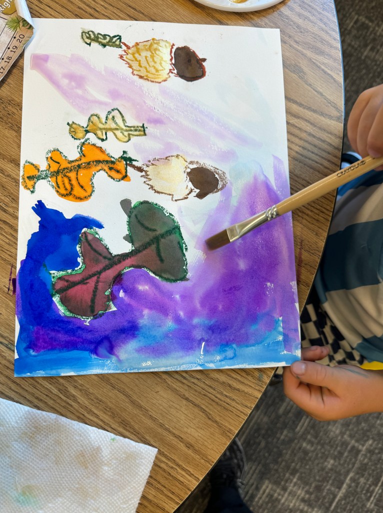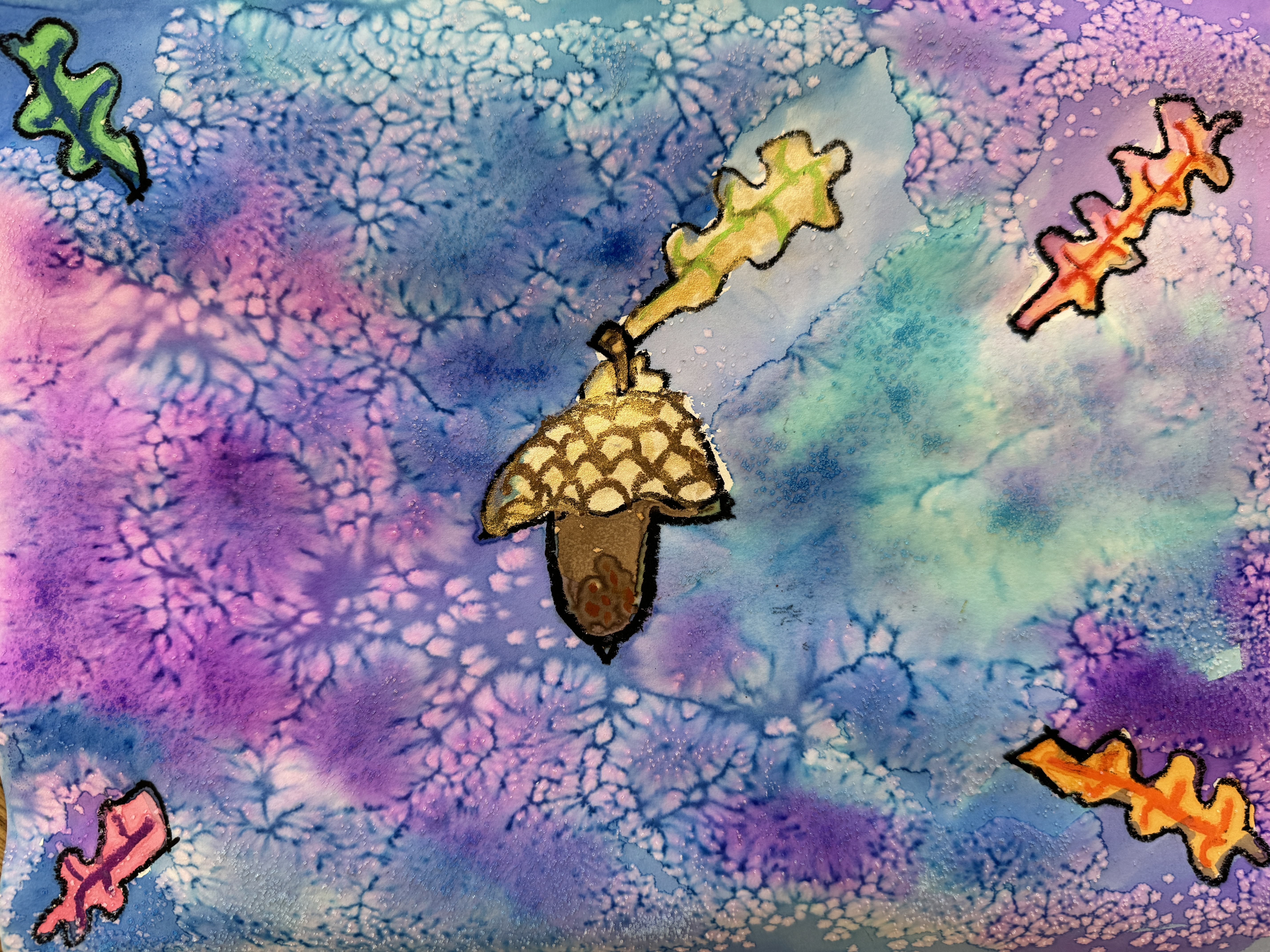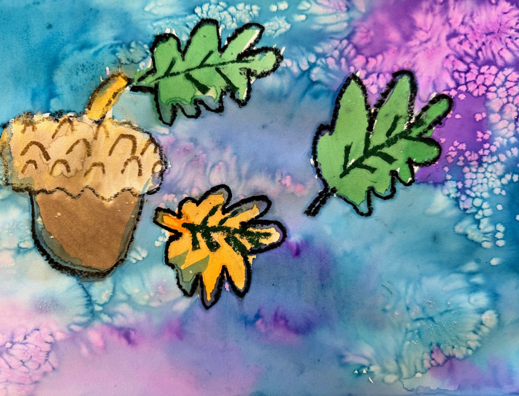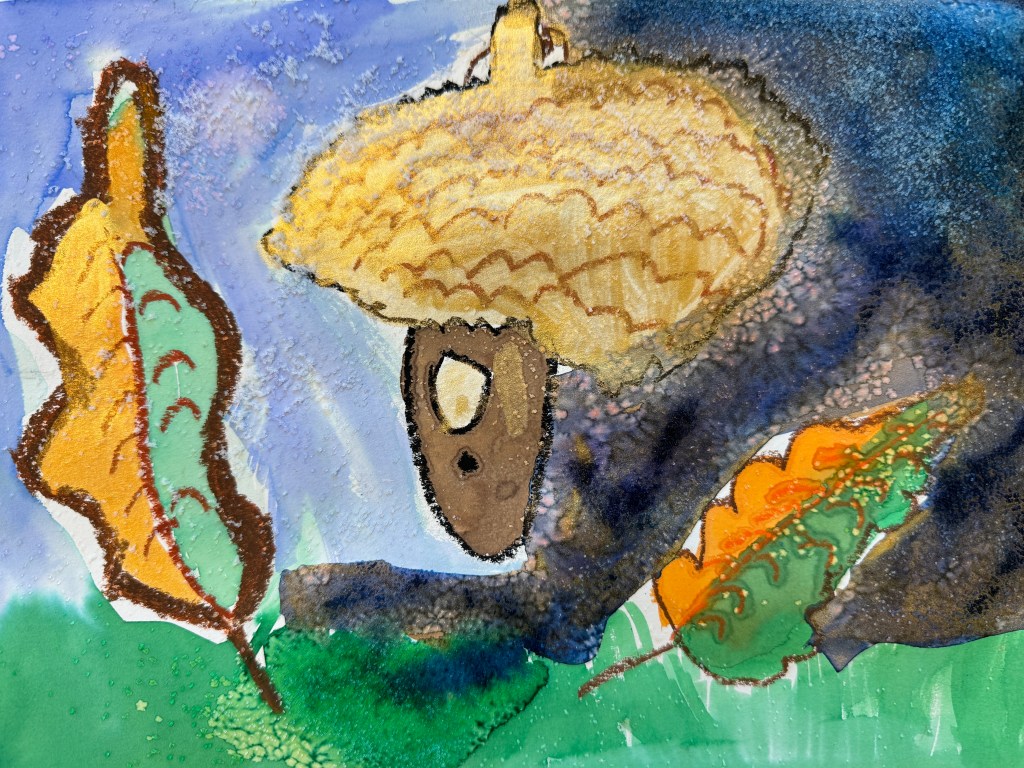 In this case, the goal of the sketching was practice for a watercolor project. Our subject was the acorn, and then we experimented with three different watercolor techniques: oil pastel resist (using oil pastel to create a border to keep paint from running), wet on wet (painting the background with water before applying the paint), and then adding some pinches of salt to create a starburst effect. First graders have so much freedom as artists, they grab the oil pastel with confidence, seemingly not worrying that they will not be able to erase a mistake. They drew and painted…with stunning outcomes.