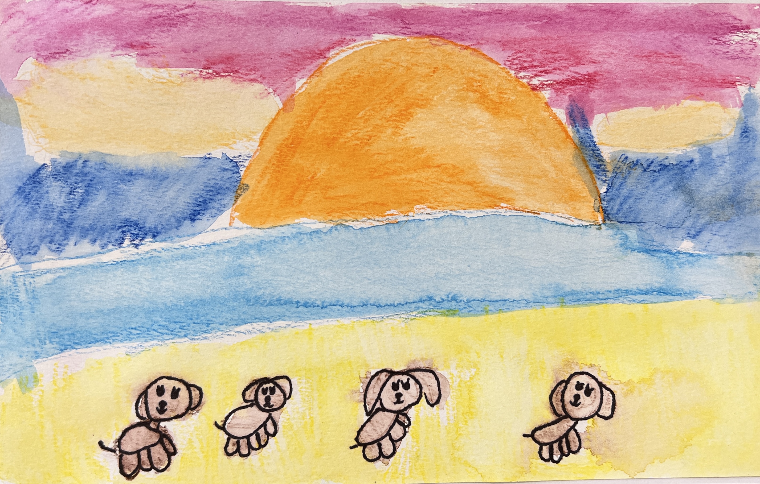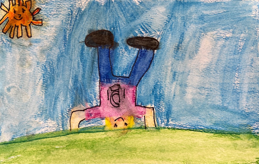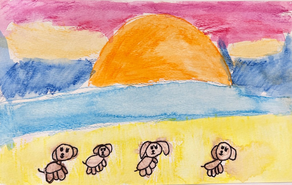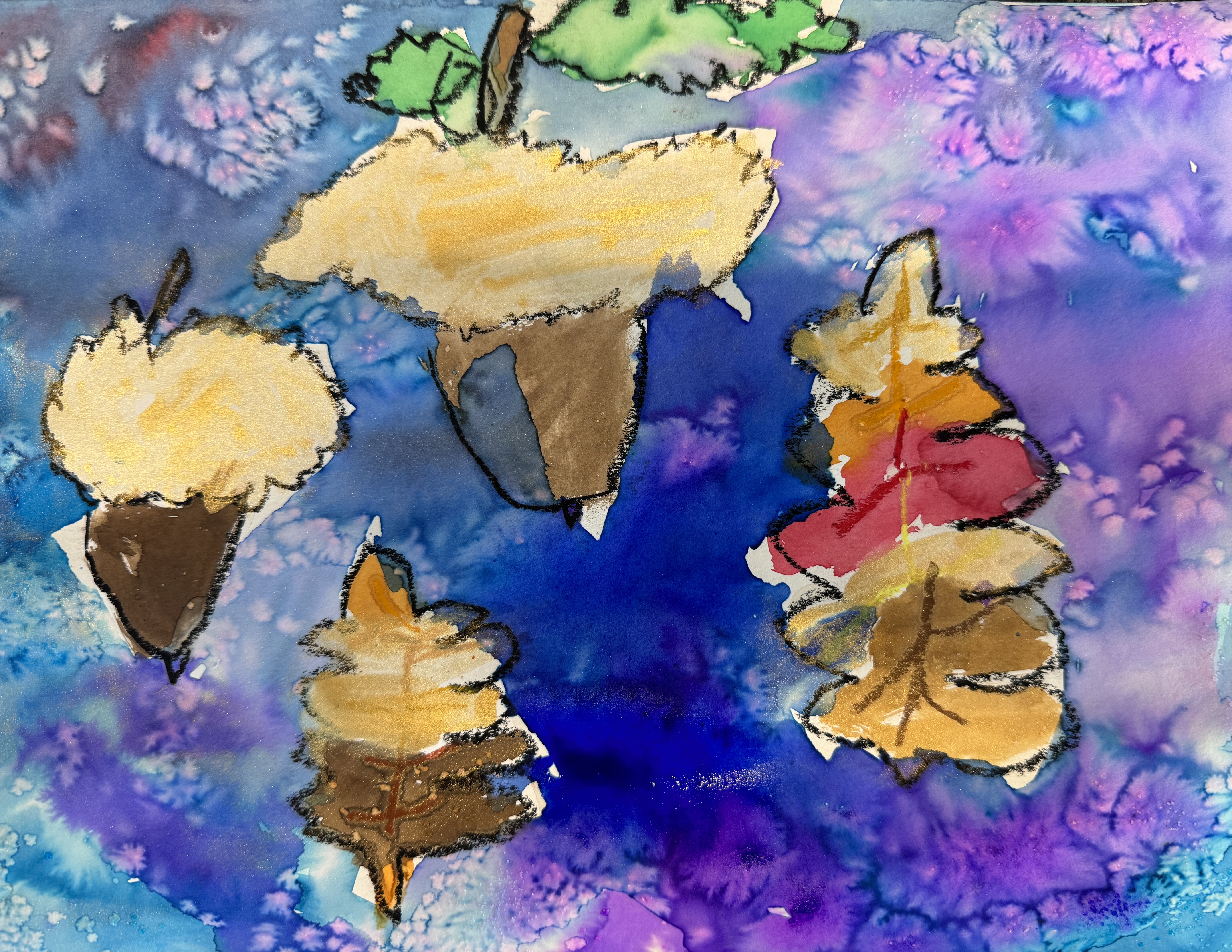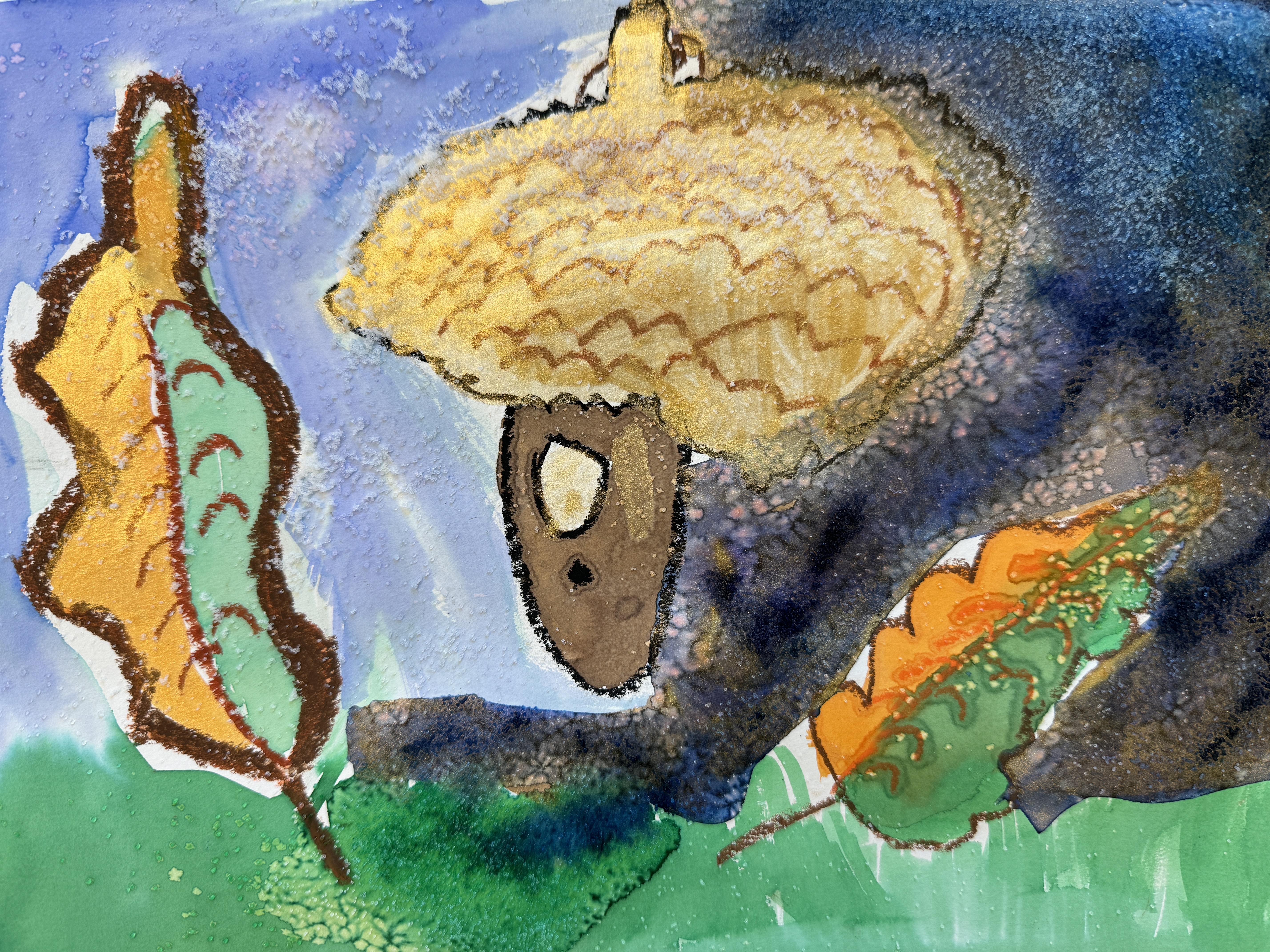 In this case, the goal of the sketching was practice for a watercolor project. Our subject was the acorn, and then we experimented with three different watercolor techniques: oil pastel resist (using oil pastel to create a border to keep paint from running), wet on wet (painting the background with water before applying the paint), and then adding some pinches of salt to create a starburst effect. First graders have so much freedom as artists, they grab the oil pastel with confidence, seemingly not worrying that they will not be able to erase a mistake. They drew and painted…with stunning outcomes.