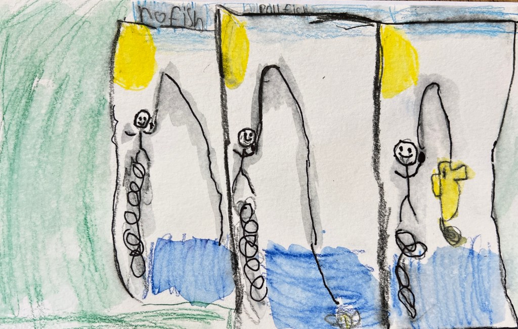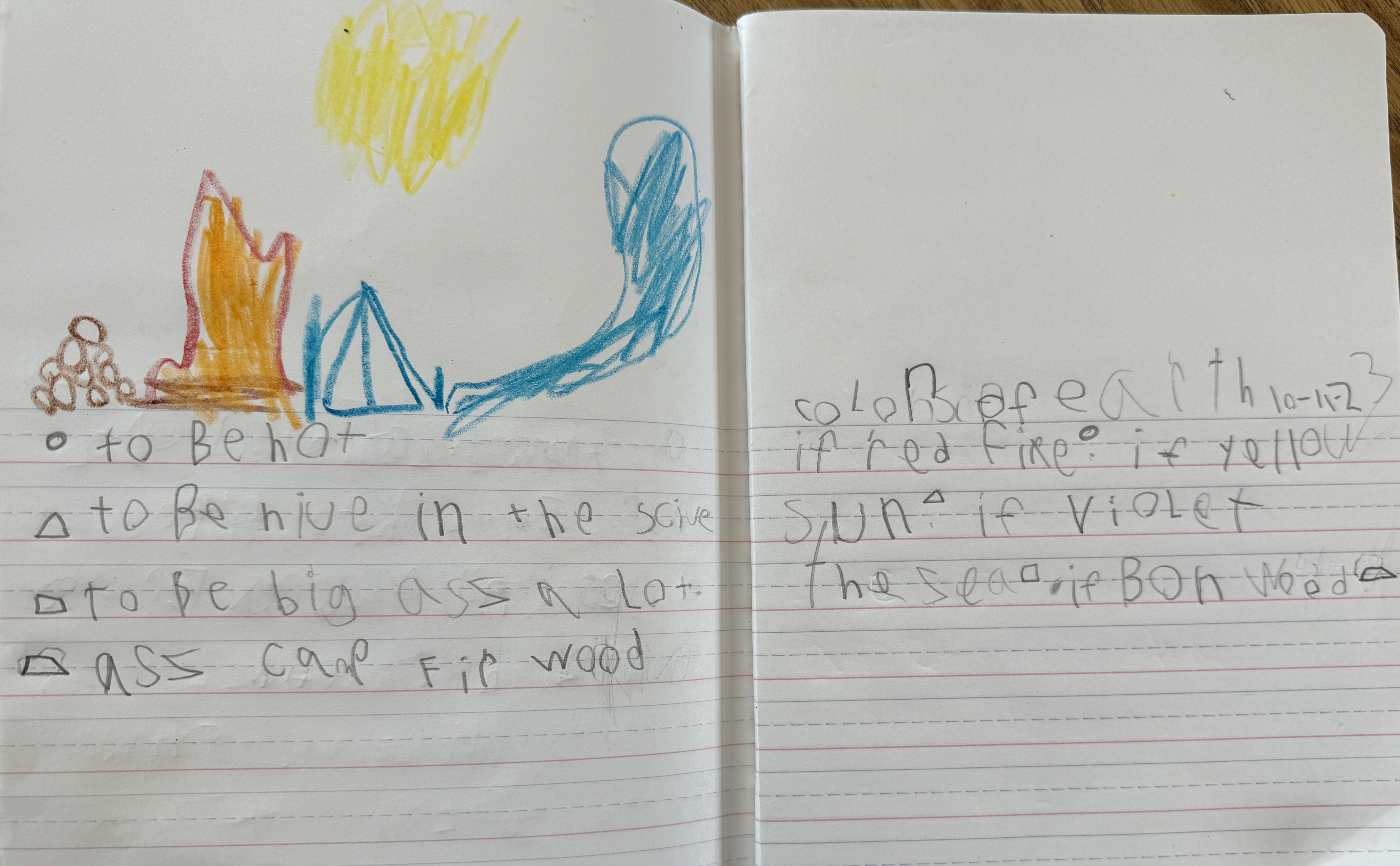 One of my more reluctant writers is now picking up the pencil and getting started. I noticed he was writing short–just picking a color and saying the thing. I quickly went over to get him to stretch past…but I could see him starting to shut down. I leaned in close and learned that he couldn’t do it because there wasn’t room…and he didn’t wait to erase. It was the perfect time to teach him a tool. I showed him how he could use a symbol to show that he needed to continue on another page. Lucky for him, he had written on the right hand page, leaving the left side open for those additions. This felt like a bit of a breakthrough teaching moment!