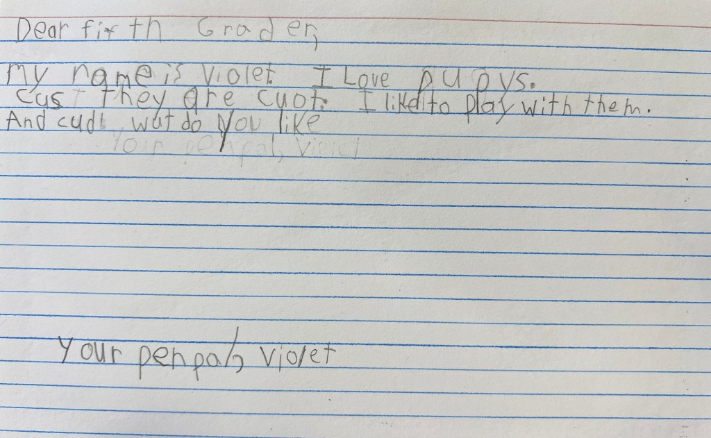 My students wrote and wrote. They chatted as they worked, encouraging each other, sharing spellings of more challenging words, asking for help from me from time to time…”How do you spell Seattle Seahawks?” “Does eclipse have a c or a k?” It was the first time this school year where we truly felt the phenomenon of flow when writing. Every one of my students was engaged, stretching themselves as writers, sharing their interests and inquiring about the interests of their penpals. They kept on writing…for more than half an hour on a Friday before lunch.