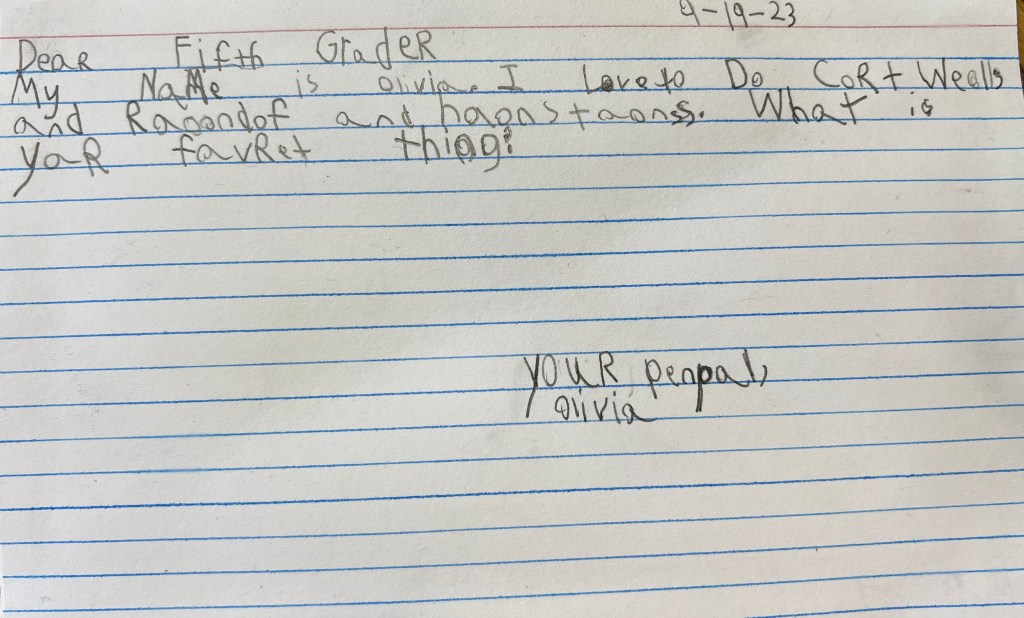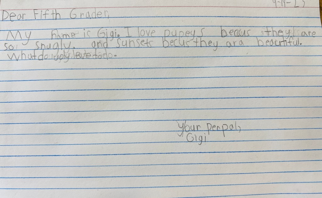 So this year when a colleague asked if I wanted to have my students be penpals with her fifth graders, I was quick to say yes. I like the idea of starting out early in the school year so we can ensure that our students can participate in several exchanges. We’re hopeful that as we progress in this penpal process that we can arrange to have our students meet in person as well.