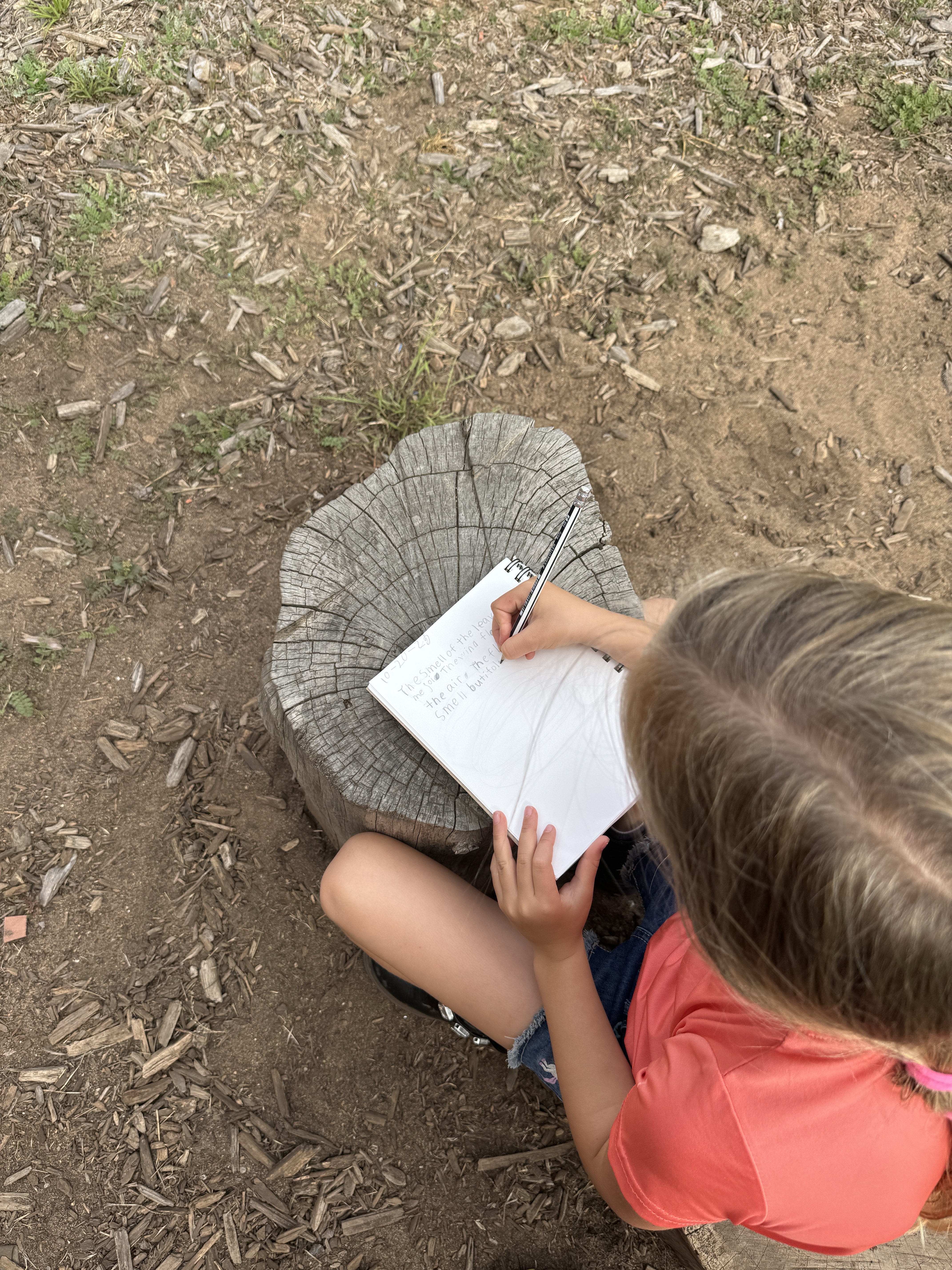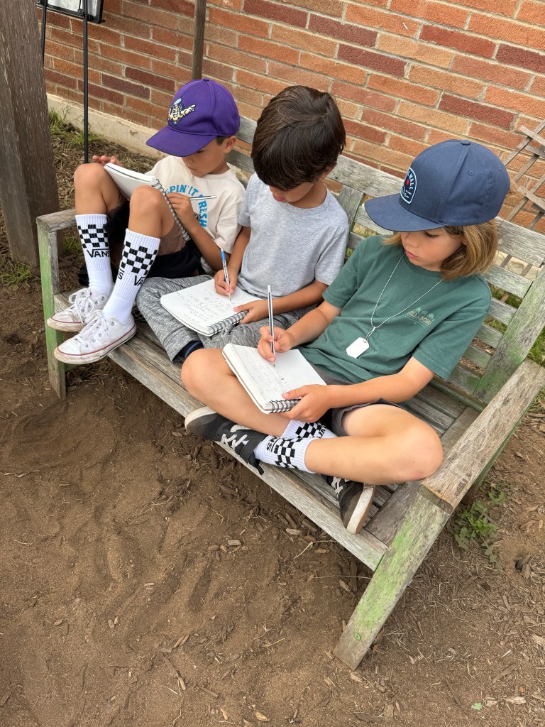 I also know that being outdoors is a powerful motivation for writing for the first graders I teach. Changing our writing venue, writing in a sketchbook rather than a notebook, and writing under the influence of nature all keep writing fresh and novel. And my writing with them also matters. I hope they are learning that writing is not just for school, but that it is a lifetime pursuit that can serve many different purposes.