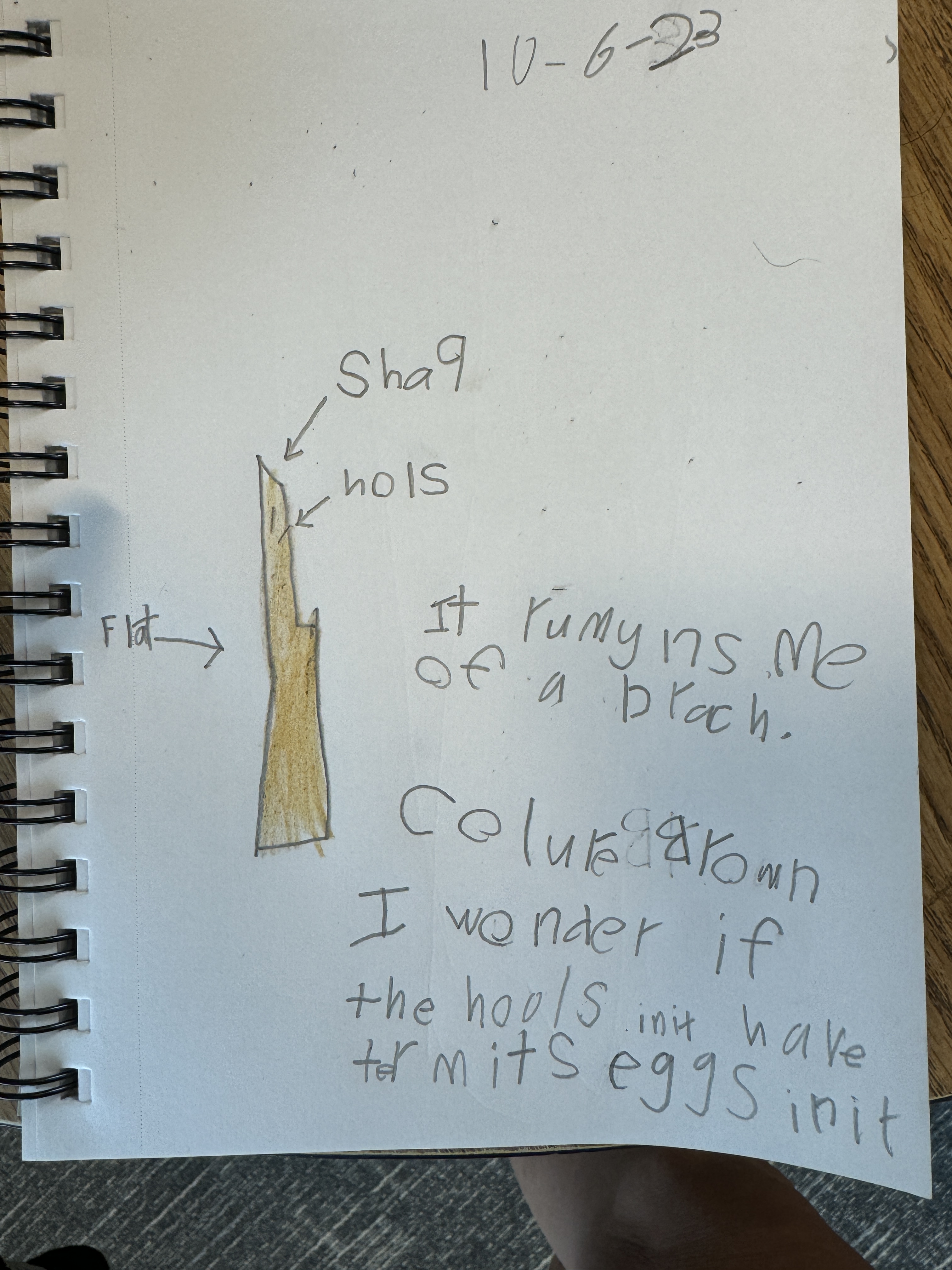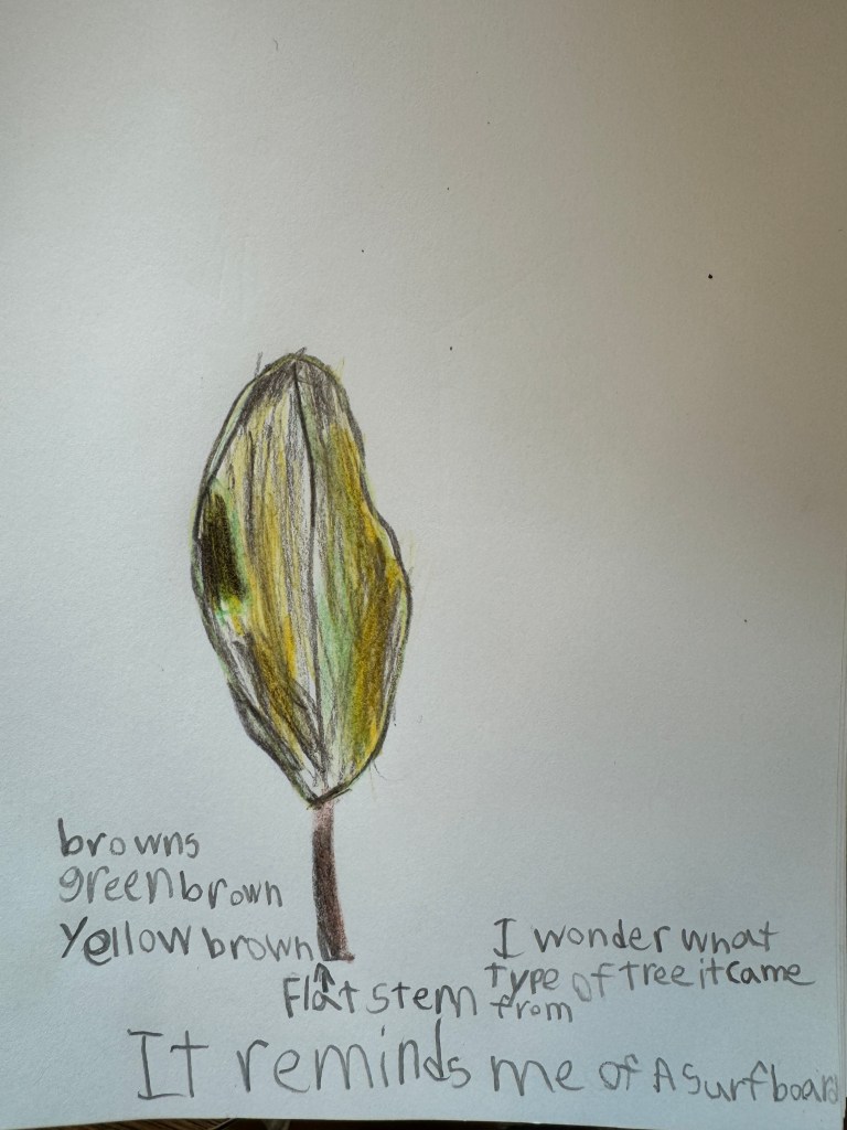 Later students had to pick just one item from their collection to examine much more closely. To facilitate that close observation, we pulled out our sketchbooks and started drawing, trying hard to capture all the details they could see in front of them. Using colored pencils to hone in on subtleties, they added dimension to their sketches. Then using nature notebooking prompts adapted from the work of John Muir Laws including labeling their sketch, adding what does it remind you of and what do you wonder about it, students completed their entry.