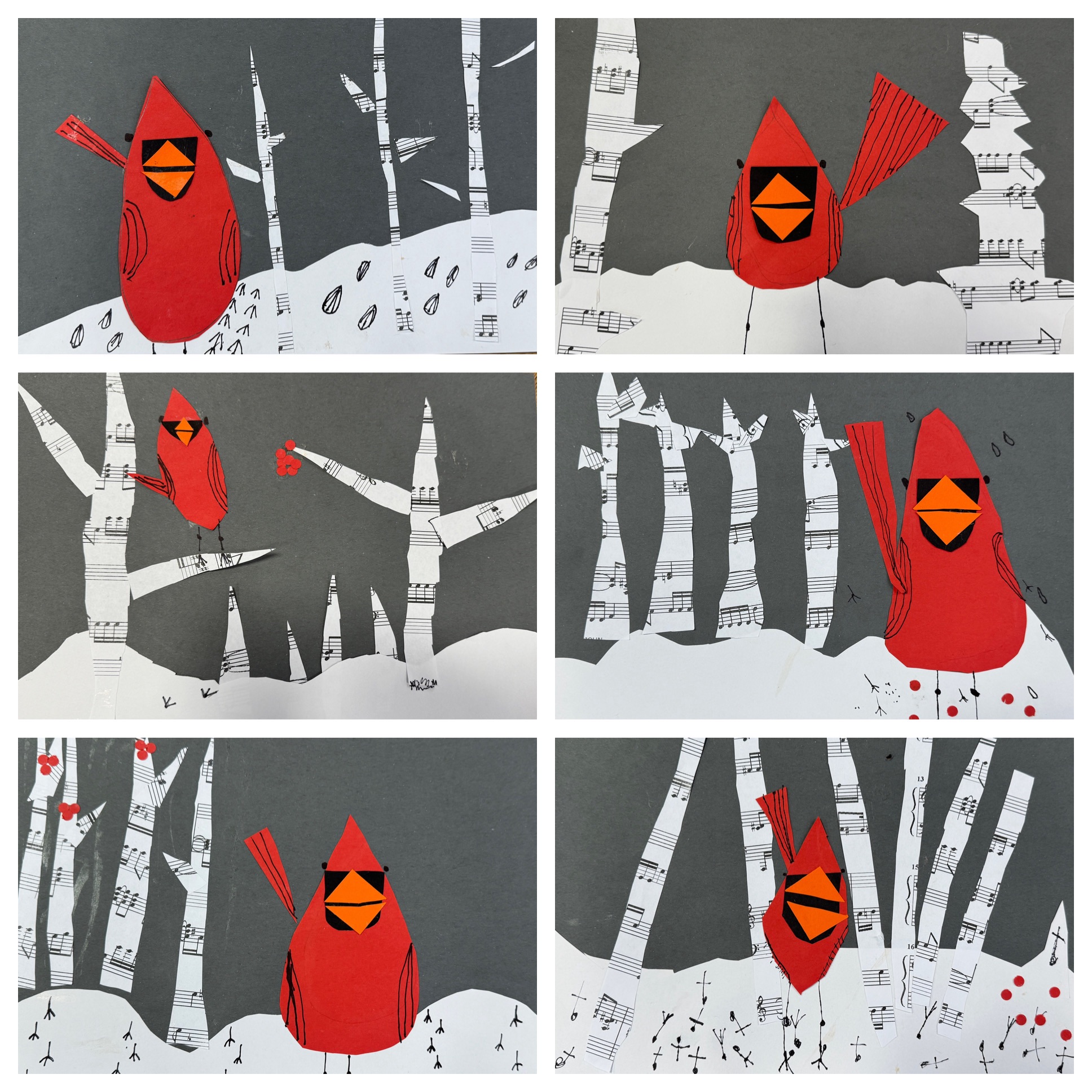 But honestly, the real payoff started to emerge in small moments as the week went on. My students started to point out metaphorical thinking throughout the school day, and in their own speech. On Tuesday, we returned to the book, Kiyoshi’s Walk by Mark Karlins as we embarked on writing 3-line poems about the cardinals we had created in the style of Charley Harper the day before.