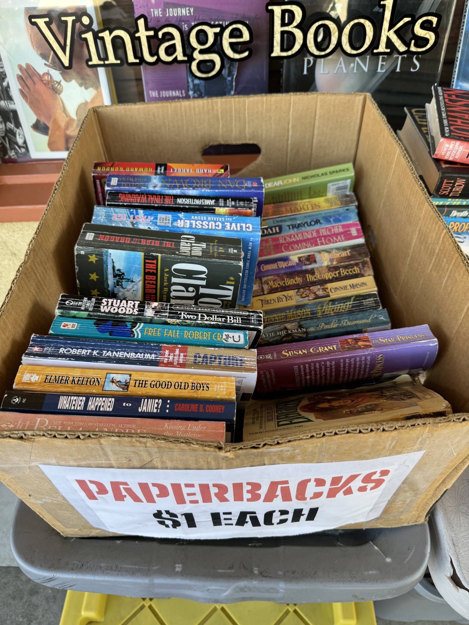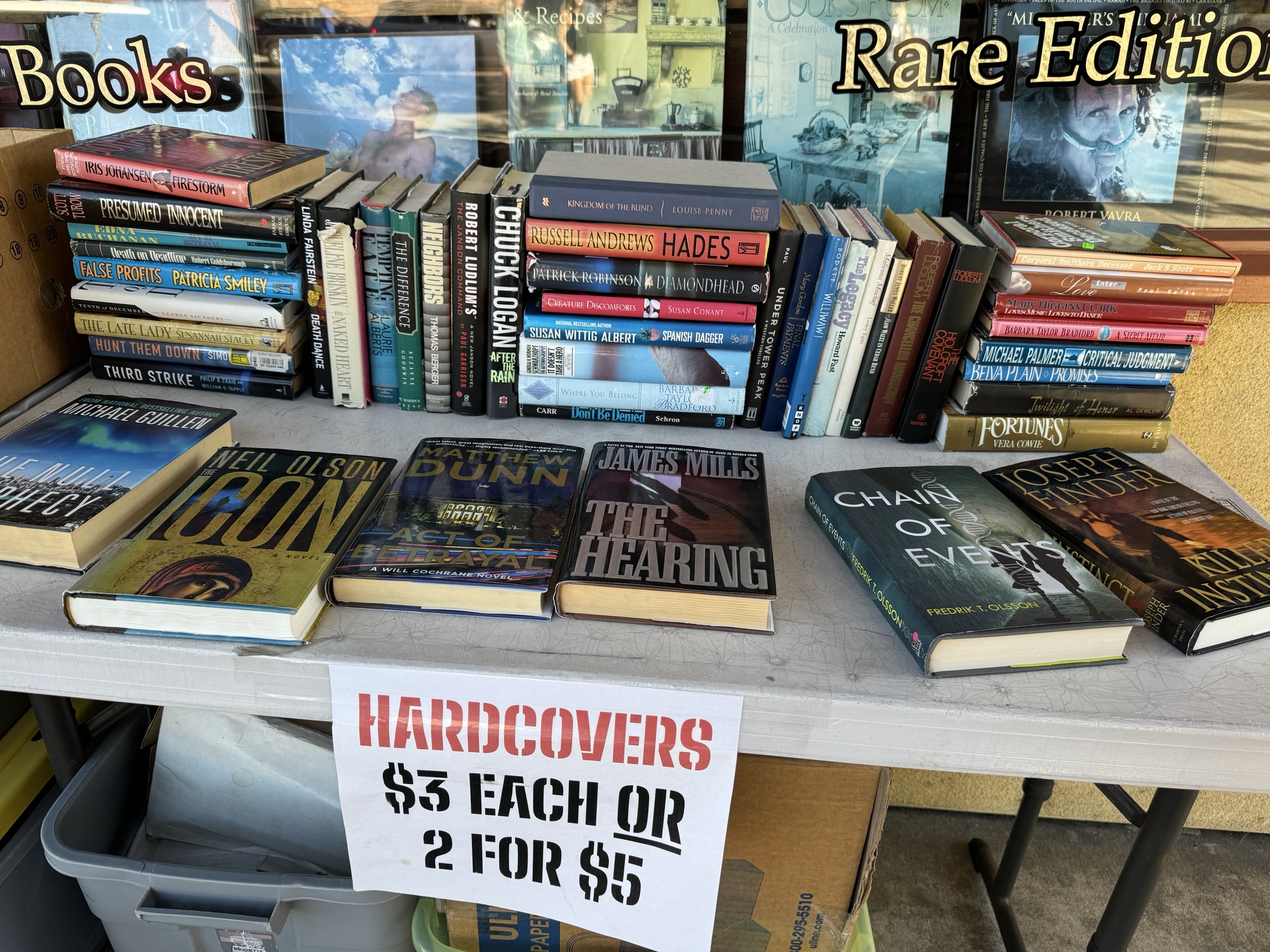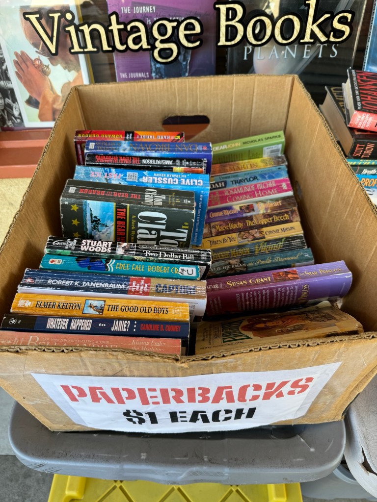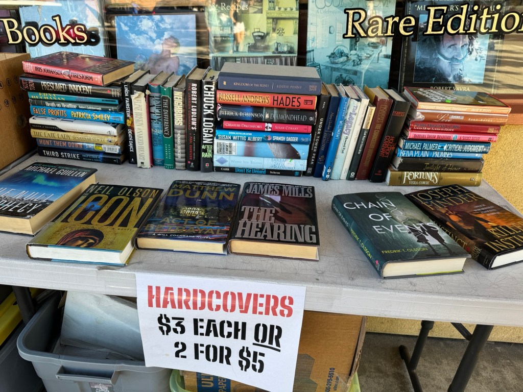 So I’m trying to get in the habit of finding math in my own daily life. And somedays I’m pretty good at it. On a walk in a local downtown I saw these boxes of books at the local used book store. What perfect math for students (or just ordinary people) to think about. What question(s) might you ask to evoke a mathematical response?