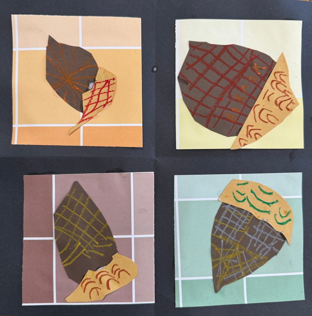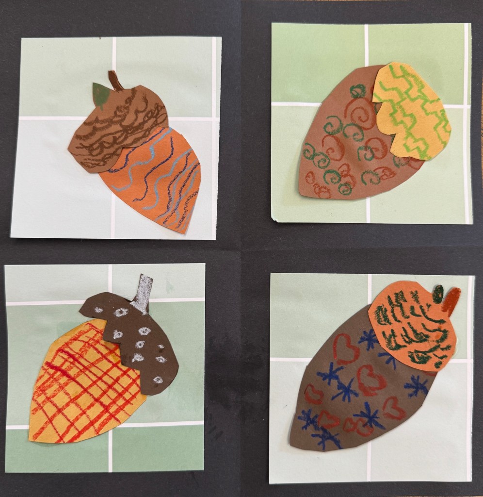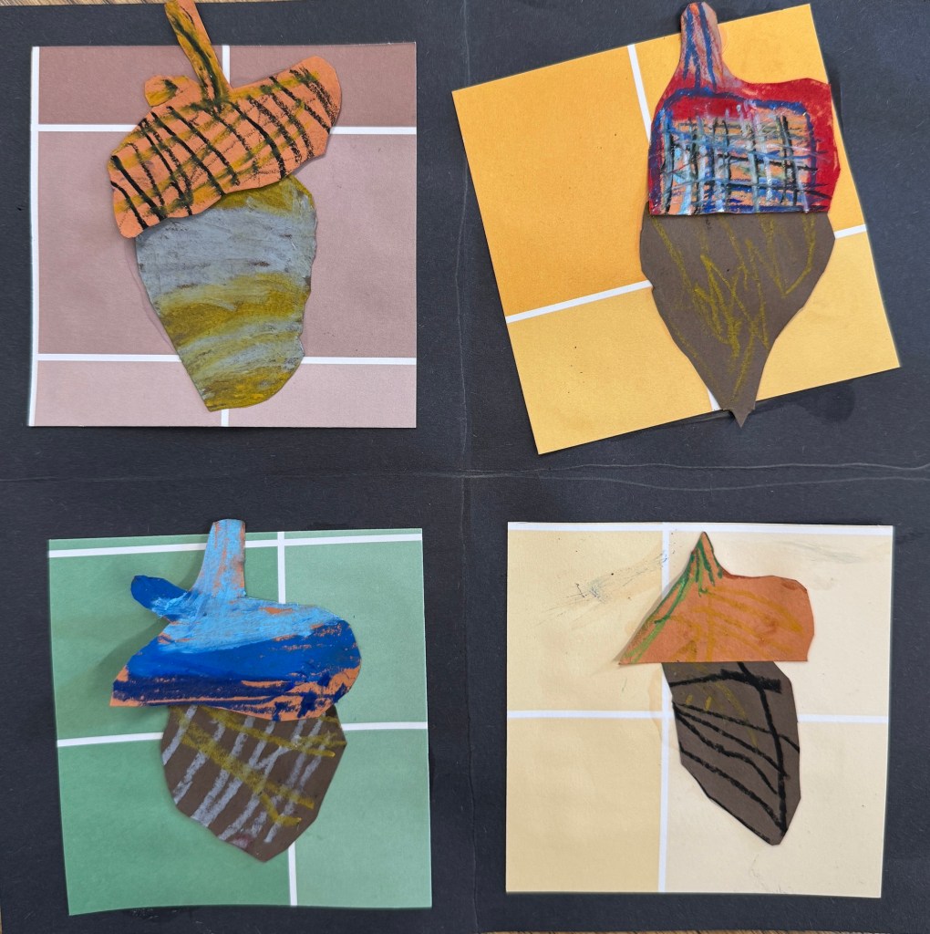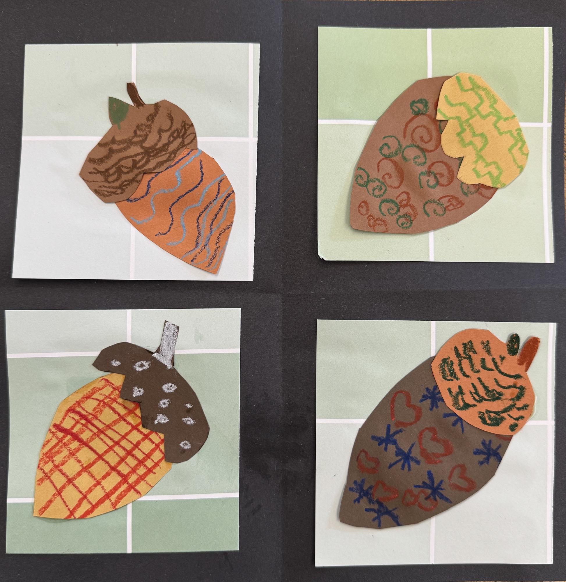 We added some whimsical texture with oil pastels…and then the most challenging part, they had to use white glue to attach their acorn pieces to the background we had assembled. Trust me, white glue can be downright scary in the hands of young artists! But with admonitions to use the glue sparingly, we were successful!