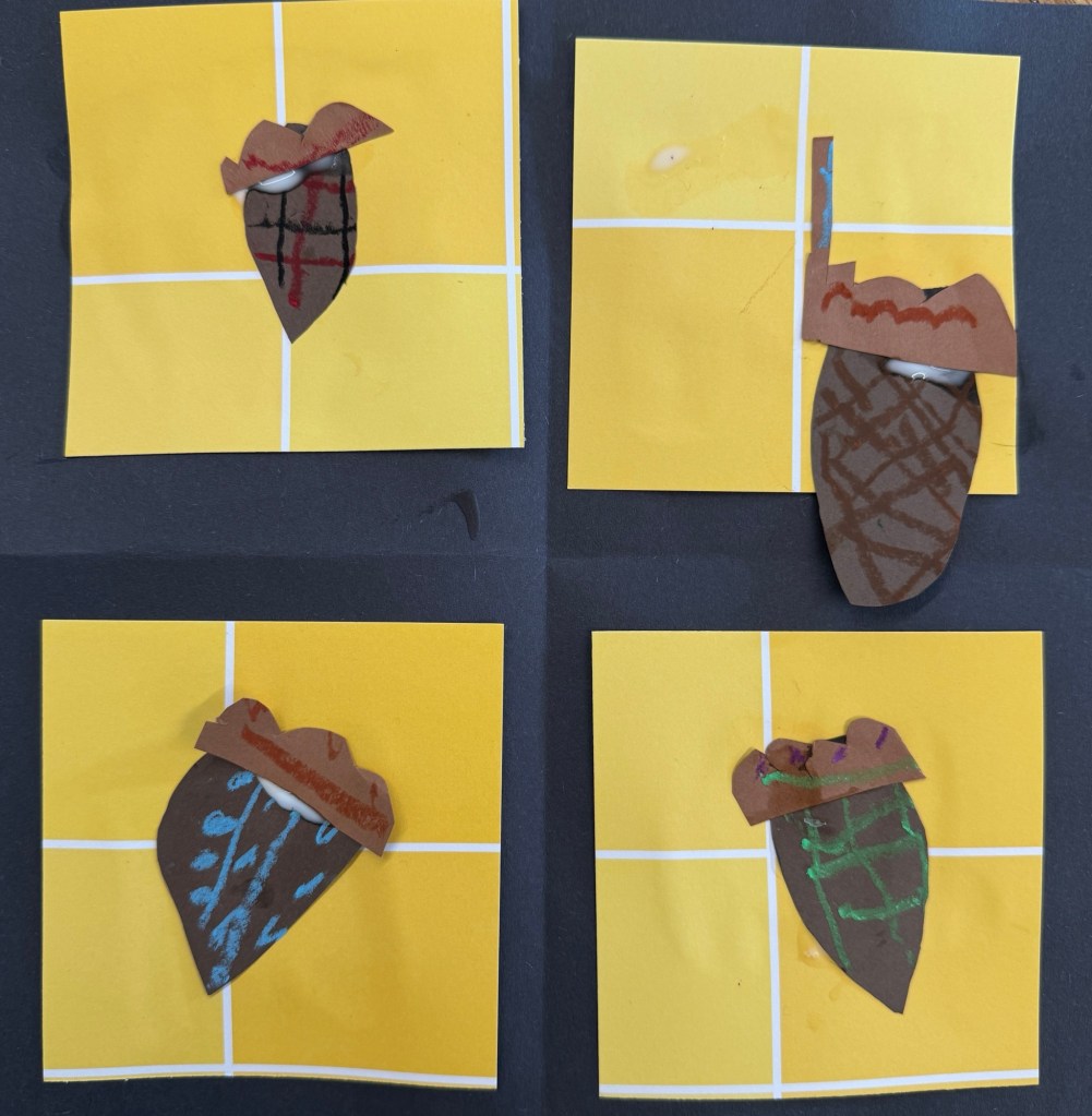 All this science and nature provided the perfect foundation for an art project inspired by Andy Warhol and the Pop Art movement. Today the first graders in my classroom used scissors, construction paper, oil pastels…and wait for it…white glue to create the most adorable acorn art. Scissor work can be challenging for young learners, and to add to the scissor demand I didn’t provide a template. Instead I showed them how to trim the square of paper into the shape of the acorn nut…and another square of paper into the shape of an acorn cap. A few students expressed frustration, but with some encouragement and insistence that they keep trying, all students were able to cut out acorns and their caps independently.